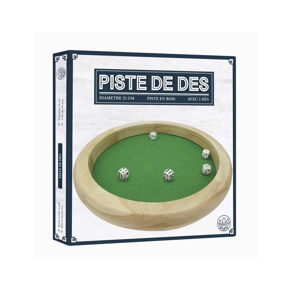 Piste de dés en bois de 35 cm de diamètre. Contient également 5 dés 16mm.