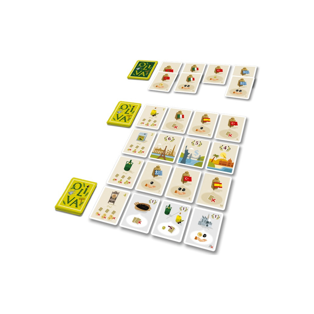 Oliva dépeint à la fois les méthodes de production traditionnelles et modernes, soulignant la productivité des petites oliveraies que l'on peut encore admirer aujourd'hui sur les collines portugaises. Le jeu reflète l'ampleur et la qualité de la production d'huile d'olive en Méditerranée, l'Espagne se rapprochant des niveaux de production de l'Italie, suivie de près par la Grèce et la Turquie