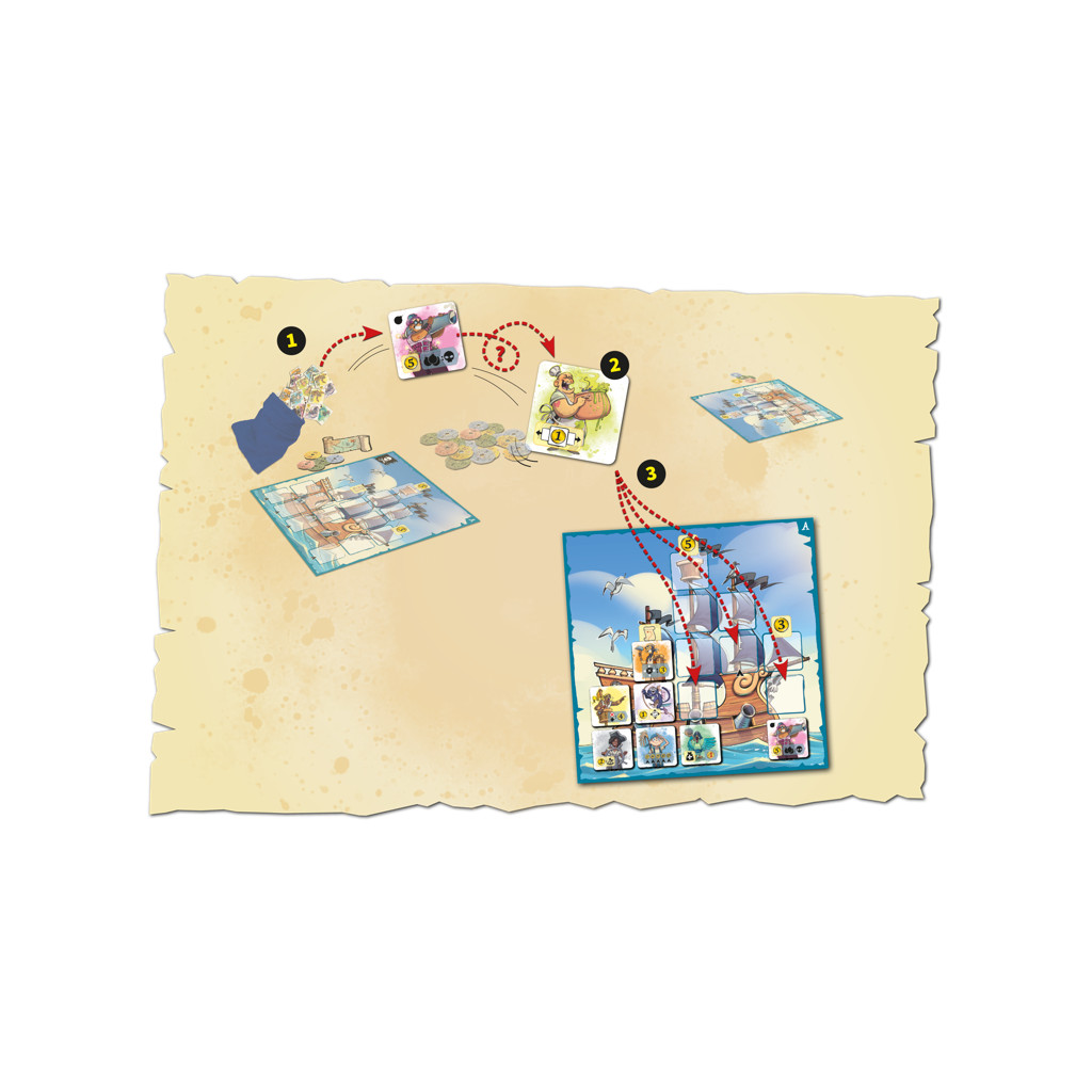 Recrutez canonnière, perroquet, navigatrice, vigie, cuistot… Accumulez des pièces mais gare à l’explosion ! La pirate la plus riche gagnera la partie.