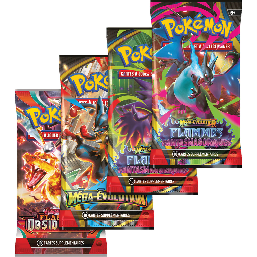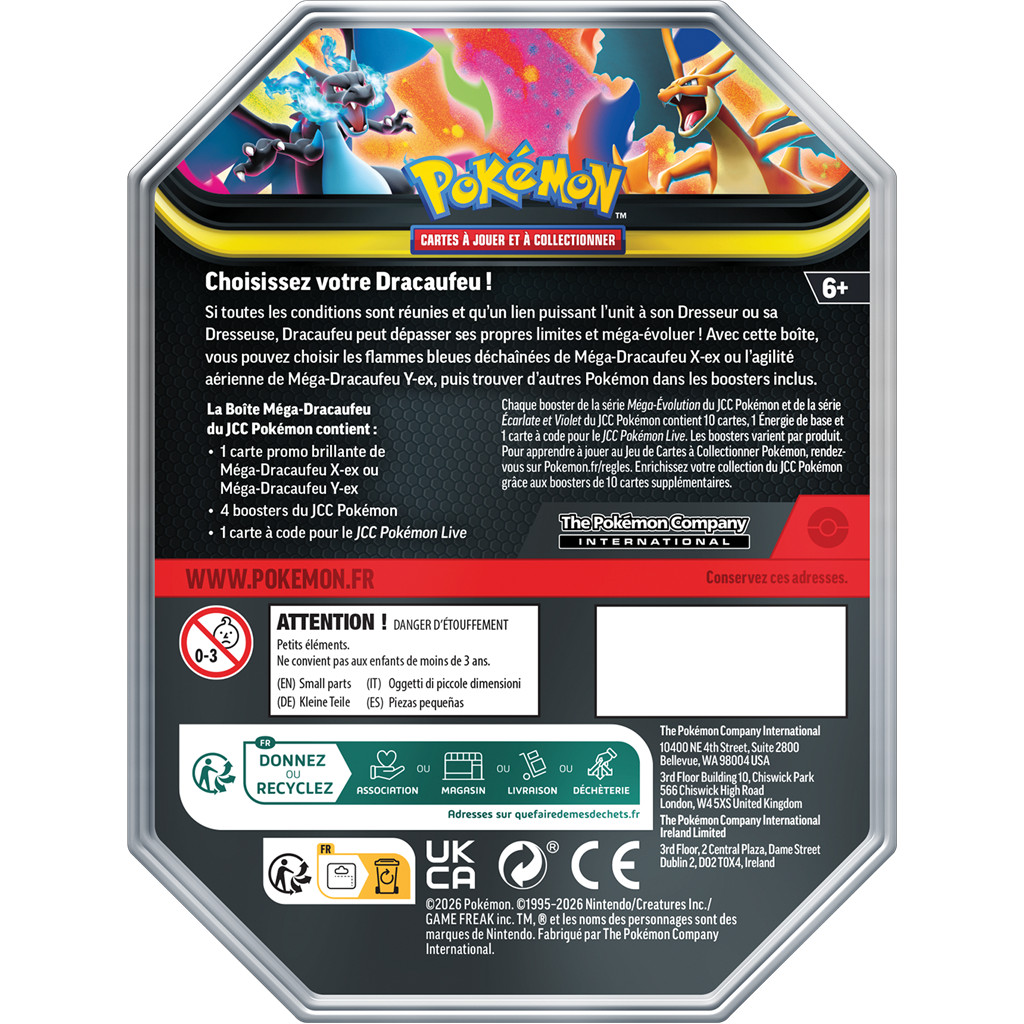 Si toutes les conditions sont réunies et qu’un lien puissant l’unit à son Dresseur ou sa Dresseuse, Dracaufeu peut dépasser ses propres limites et méga-évoluer ! Avec cette boîte, vous pouvez choisir les flammes bleues déchaînées de Méga-Dracaufeu X-ex ou l’agilité aérienne de Méga-Dracaufeu Y-ex, puis trouver d’autres Pokémon dans les boosters inclus.