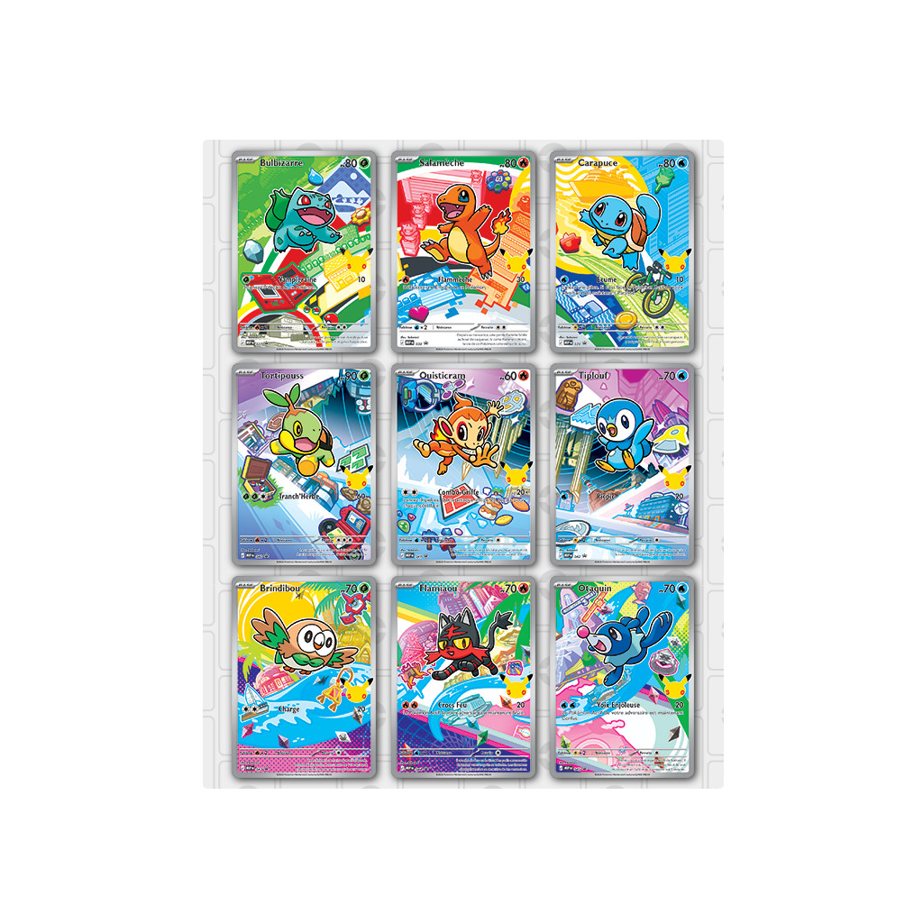 Pour chaque Dresseur ou Dresseuse, l’aventure commence avec un premier partenaire, un ami loyal qui vous accompagne quoi qu’il arrive. Revivez quelques-unes de vos aventures préférées et célébrez le lien entre Dresseur ou Dresseuse et Pokémon avec un lot de boosters contenant trois des neuf cartes promo de style « illustration rare » mettant en vedette des premiers partenaires Pokémon appréciés des régions de Kanto, Sinnoh ou Alola. Vous trouverez également deux boosters supplémentaires et une superbe page d’autocollants de premiers partenaires Pokémon.