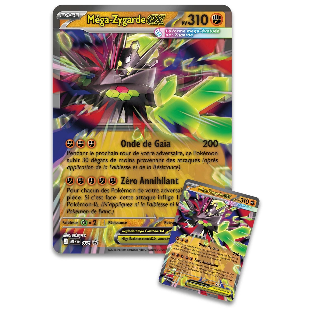 Doté de plusieurs formes et d’une puissance légendaire, Zygarde réserve bien des surprises, dont celle de pouvoir se transformer en Pokémon-ex Méga-Évolution. Décimez la stratégie de votre adversaire en infligeant des dégâts massifs grâce aux incroyables attaques de Zygarde. Vous trouverez dans cette collection une carte promo brillante pour le jeu de Méga-Zygarde-ex, ainsi qu’une carte grand format lenticulaire et un autocollant réajustable. Boostez vos parties et soutenez Méga-Zygarde-ex avec des boosters de différentes extensions du JCC Pokémon.