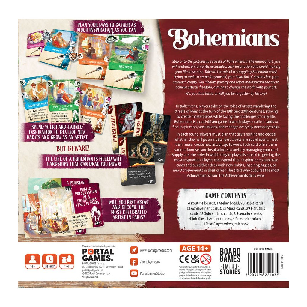 Dans Bohemians, les joueurs incarnent des artistes errant dans les rues de Paris à la fin du XIXᵉ et au début du XXᵉ siècle, cherchant à créer des chefs-d’œuvre tout en affrontant les défis de la vie quotidienne. Ce jeu de cartes demande aux joueurs de collecter des cartes pour trouver l’inspiration, rencontrer leurs muses et gérer les tâches nécessaires au quotidien.