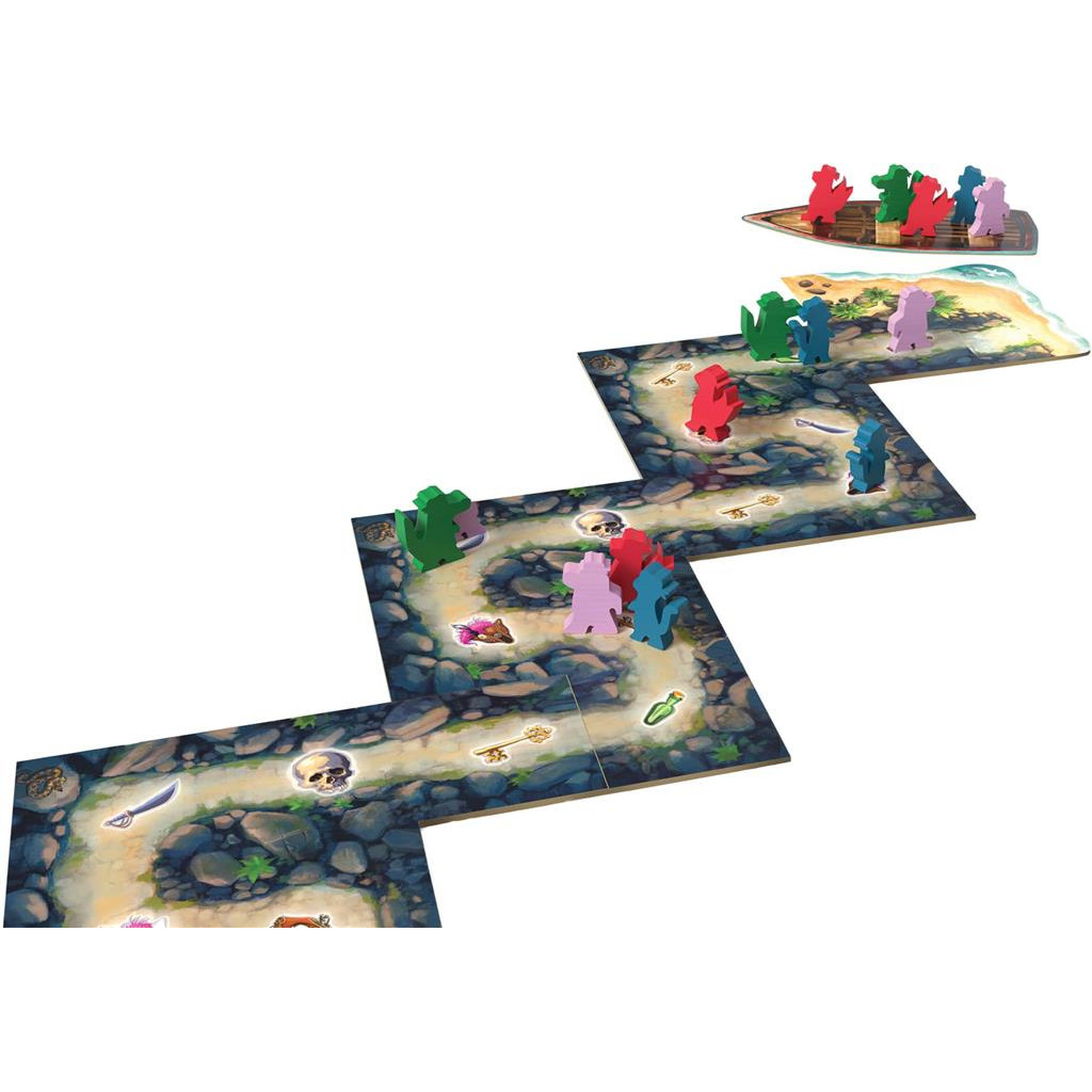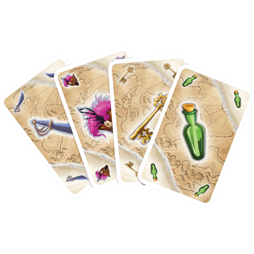 Pour déplacer un pirate, vous devez jouer une carte portant l’un des six symboles, et déplacez l’un de vos pirates vers le prochain symbole correspondant dans le tunnel, en sautant par-dessus ceux où un autre pirate se trouve déjà. Pour obtenir de nouvelles cartes, reculez vers la première case qui contient un ou deux pirates. - Dans Ô Capitaine ! Mon Capitaine, vous placez un chapeau de capitaine sur l’un de vos pirates et utilisez les pouvoirs de ce chef. Dans “Radeaux précaires”, vous pouvez tenter de vous échapper plus rapidement de la forteresse sur un radeau qui fuit — en risquant de couler.
