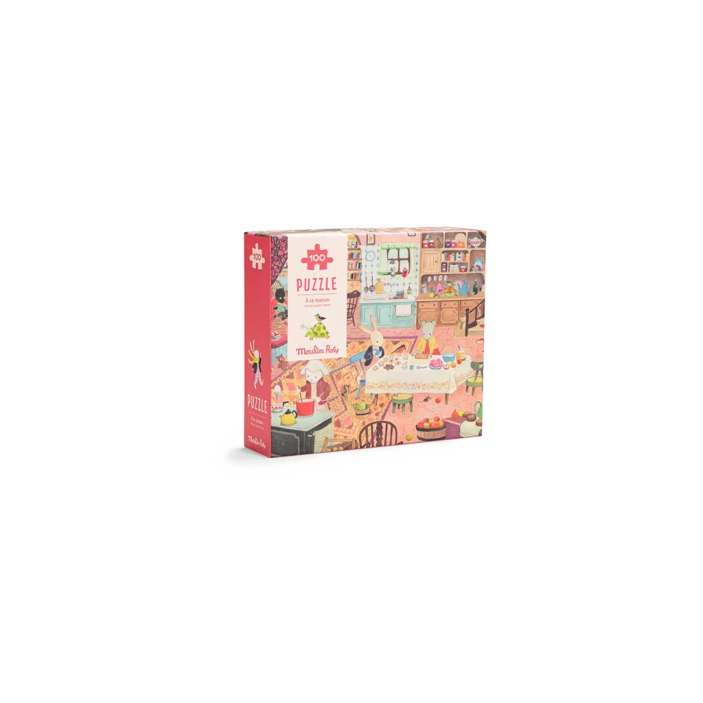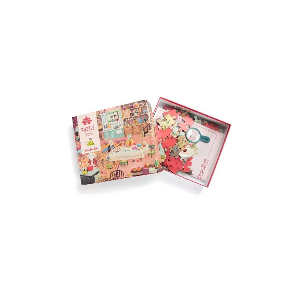 Puzzle d'observation "A la maison" de la Grande Famille comprenant 100 pièces. Après l'avoir reconstitué, les enfants s’amuseront à retrouver les animaux et objets cachés dans l’illustration, en utilisant la loupe pour les aider.