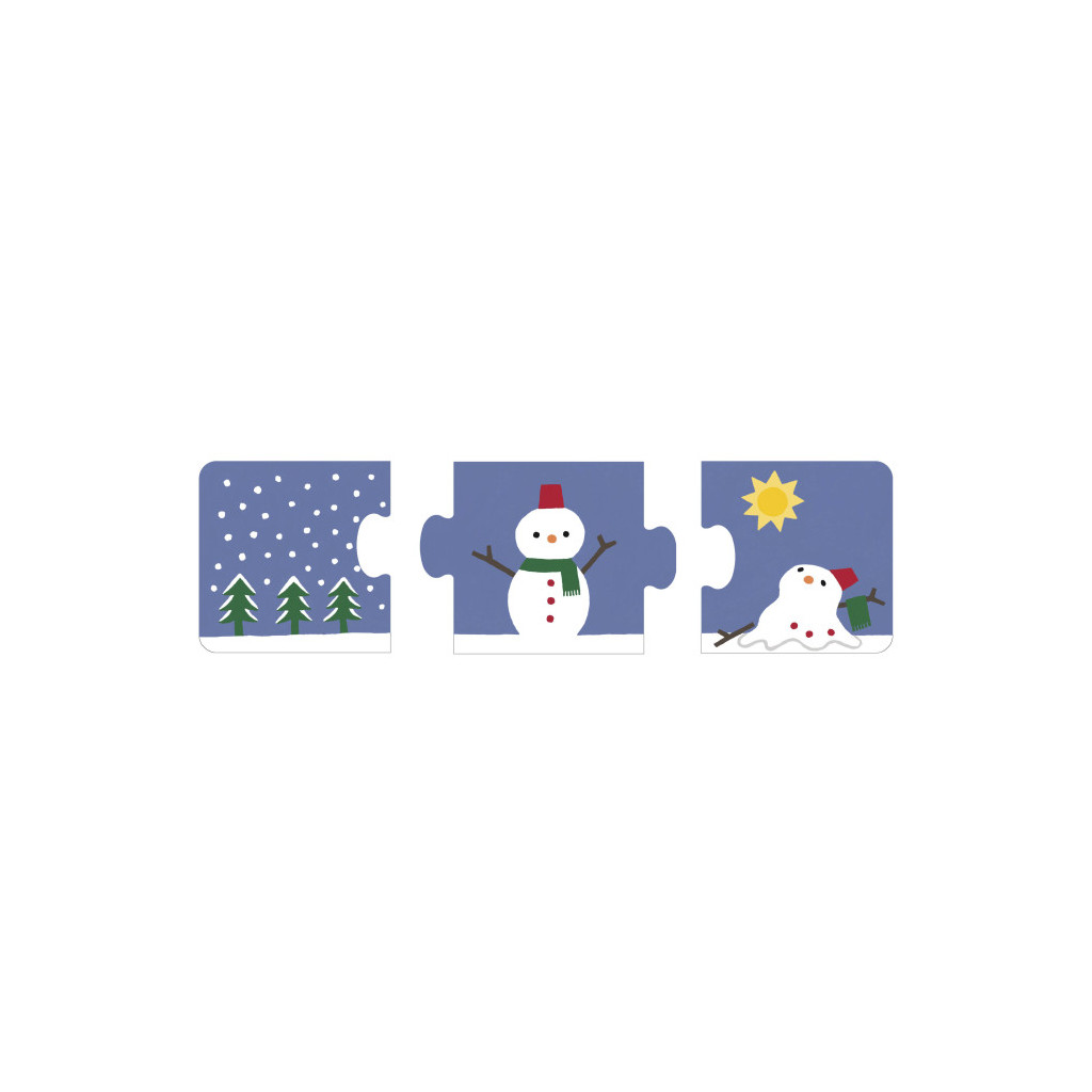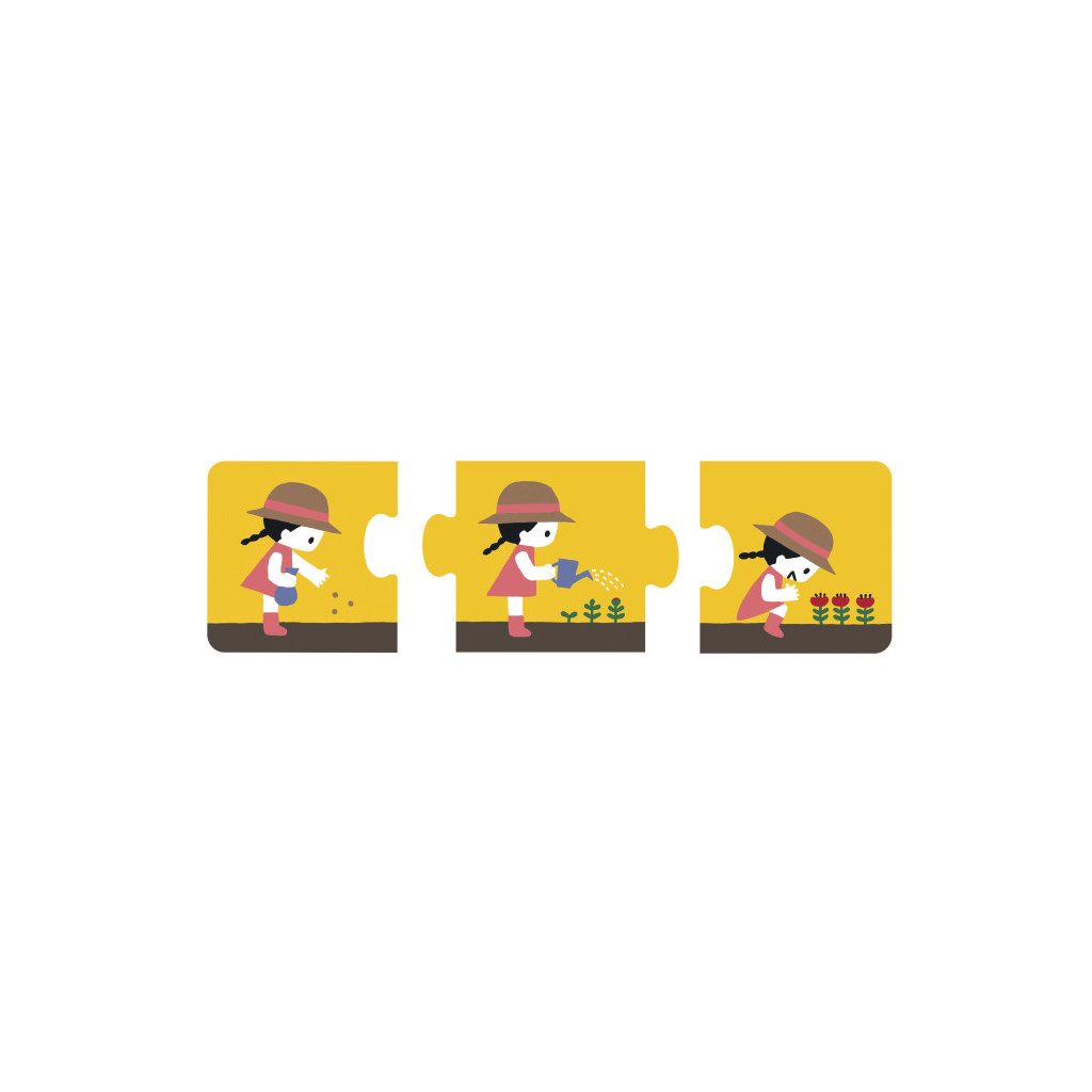 On plante des graines, on arrose, et voici des fleurs… C’est l’hiver, puis le printemps, les oiseaux font leur nid, et voici l’été… On construit un igloo, bonne nuit… 5 puzzles de 3 pièces pour les tout-petits, à assembler suivant un ordre logique et qui racontent des histoires toutes simples.