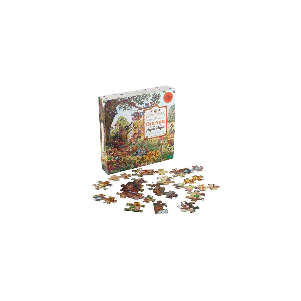 En assemblant les 100 pièces du puzzle, vous découvrirez le magnifique pique-nique organisé par Ourson et ses amis. Grâce au poster à taille réelle qui servira de base pour l'assemblage du puzzle, vous pourrez également vous amuser à chercher et trouver 20 petites scénettes dissimulées dans l'illustration, présentes au verso du poster.