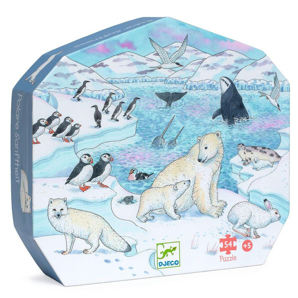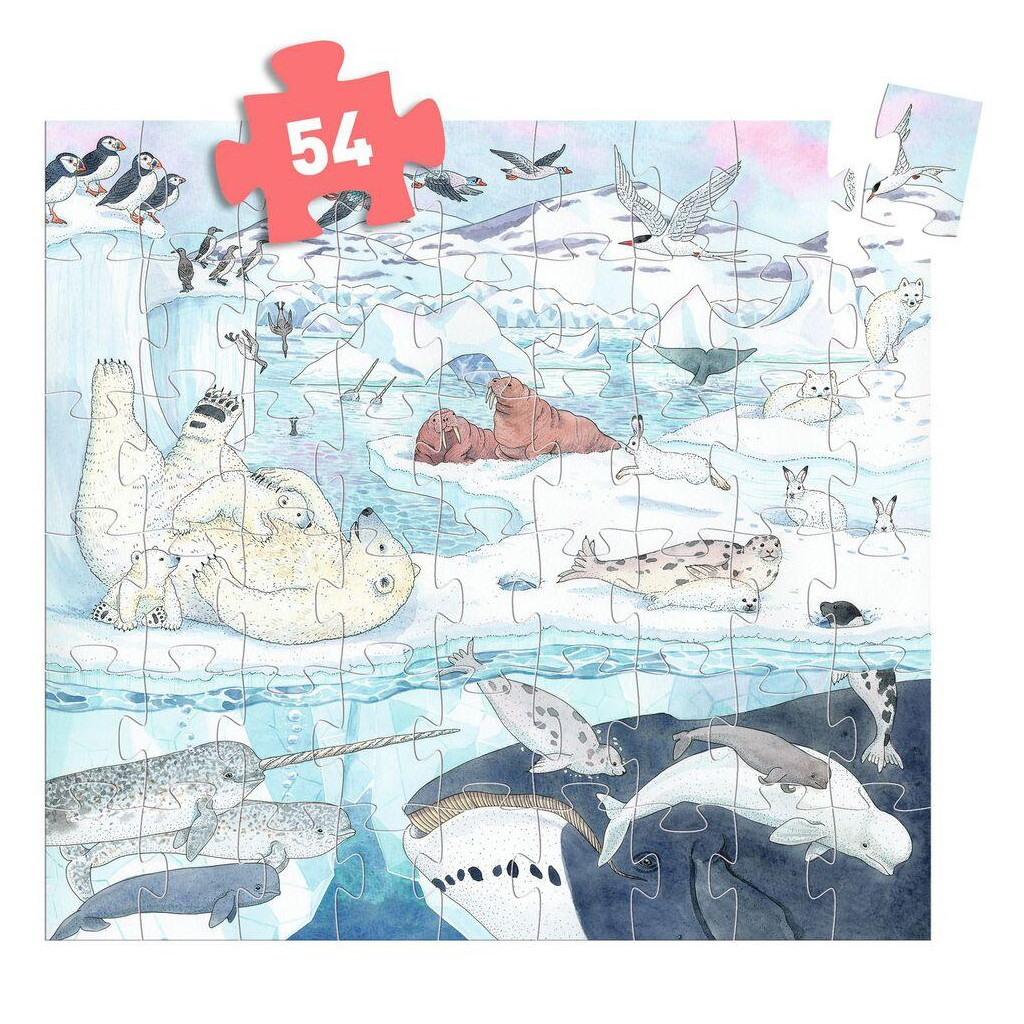Explorez l’Arctique et laissez-vous bercer par la douceur de ses animaux polaires et de ses paysages glacés. Ce puzzle coloré de 54 pièces est présenté dans une jolie boîte silhouette en forme d'arbre.