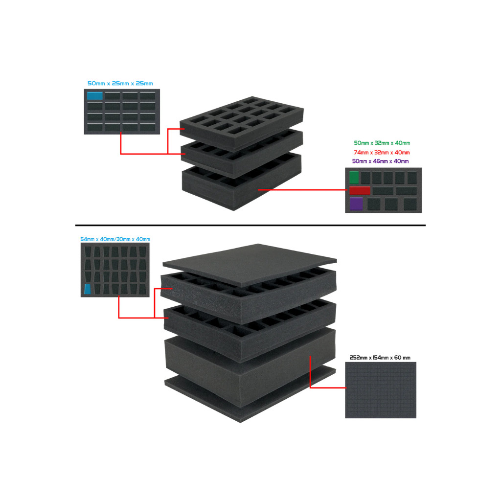 Deux plateaux en mousse pour les socles de 20 à 25 mm, trois pour les socles de 30 à 40 mm, plus un plateau personnalisable pour les figurines plus grandes ou de taille inhabituelle ; vos armées restent protégées, organisées et prêtes à être déployées.