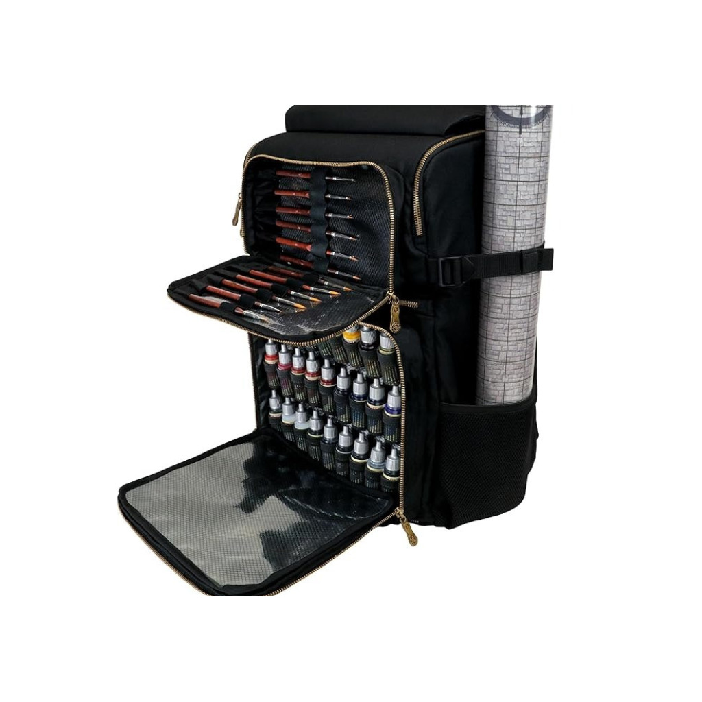 un support latéral maintient votre tapis de jeu en place ; des poches extérieures et intérieures permettent de ranger la peinture, les pinceaux et les figurines ; des fermetures éclair robustes et un sac de transport rembourré rendent les tournois et les rencontres agréables et sans stress.