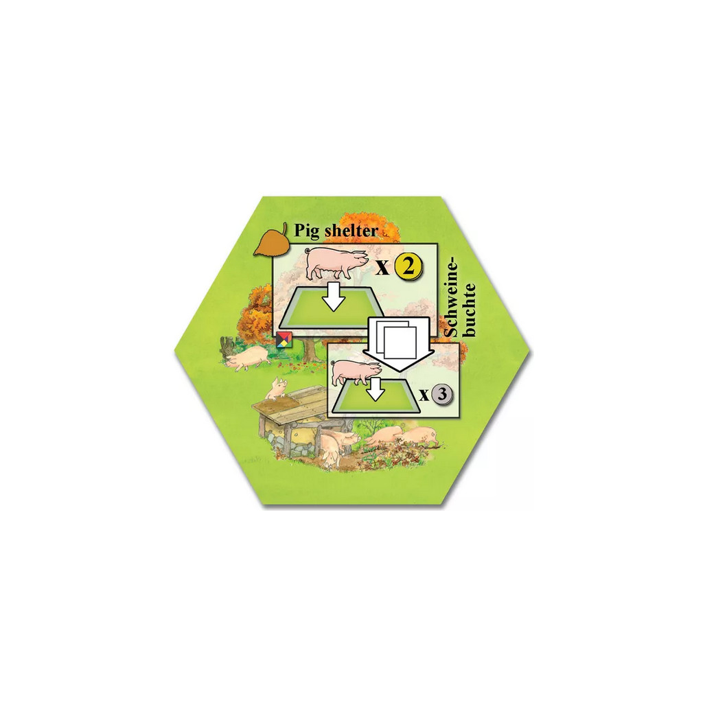 Une nouvelle tuile de village pour le jeu Keyflower. La tuile Pig Selter fait écho à la tuile Sheep Shelter incluse dans Keyflower: The Farmers. Les cochons placés dans le champ formé par cette tuile peuvent être affectés à l'abri à cochons. À la fin de la partie, chaque cochon affecté rapporte le nombre de points indiqué.