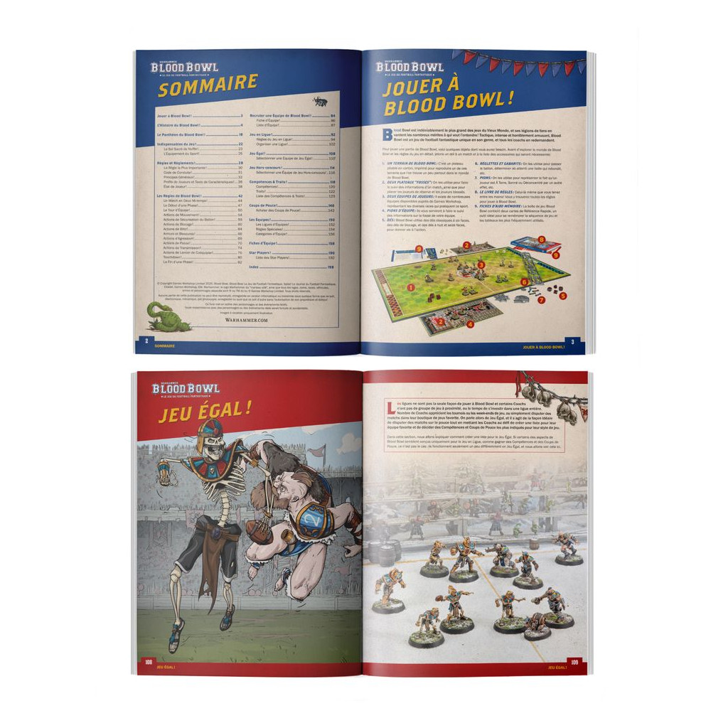 - Jeu Égal et Jeu en Ligue: Les règles pour lancer vos propres Ligues de Blood Bowl et faire progresser votre équipe au fil d'une saison, en améliorant vos joueurs et en composant avec leurs blessures.