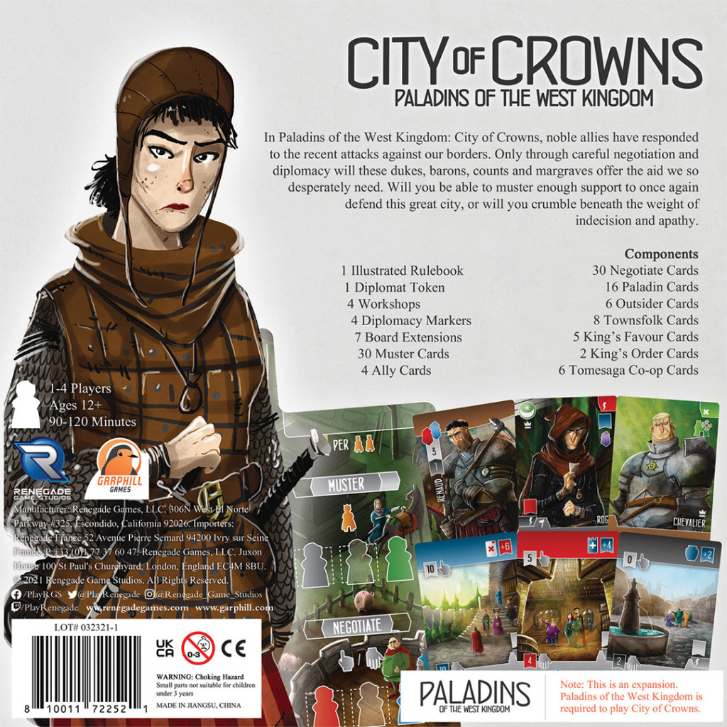 Libérez le pouvoir de la diplomatie stratégique et rassemblez le soutien des nobles dans l’extension Paladins of the West Kingdom : City of Crowns de Renegade Game Studios. Alors que le royaume fait face à des attaques incessantes, votre habileté en négociation devient essentielle. Naviguez dans l’intrigue complexe des alliances avec ducs, barons, comtes et margraves, et utilisez leur aide pour défendre la grande ville et espérer la victoire. Serez-vous à la hauteur ou succomberez-vous aux périls de l’indécision et de l’apathie ?