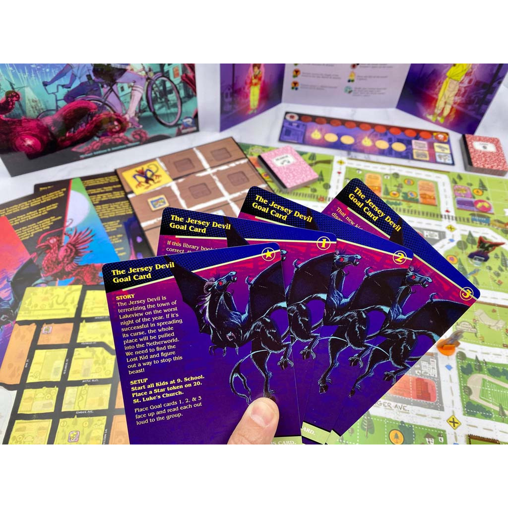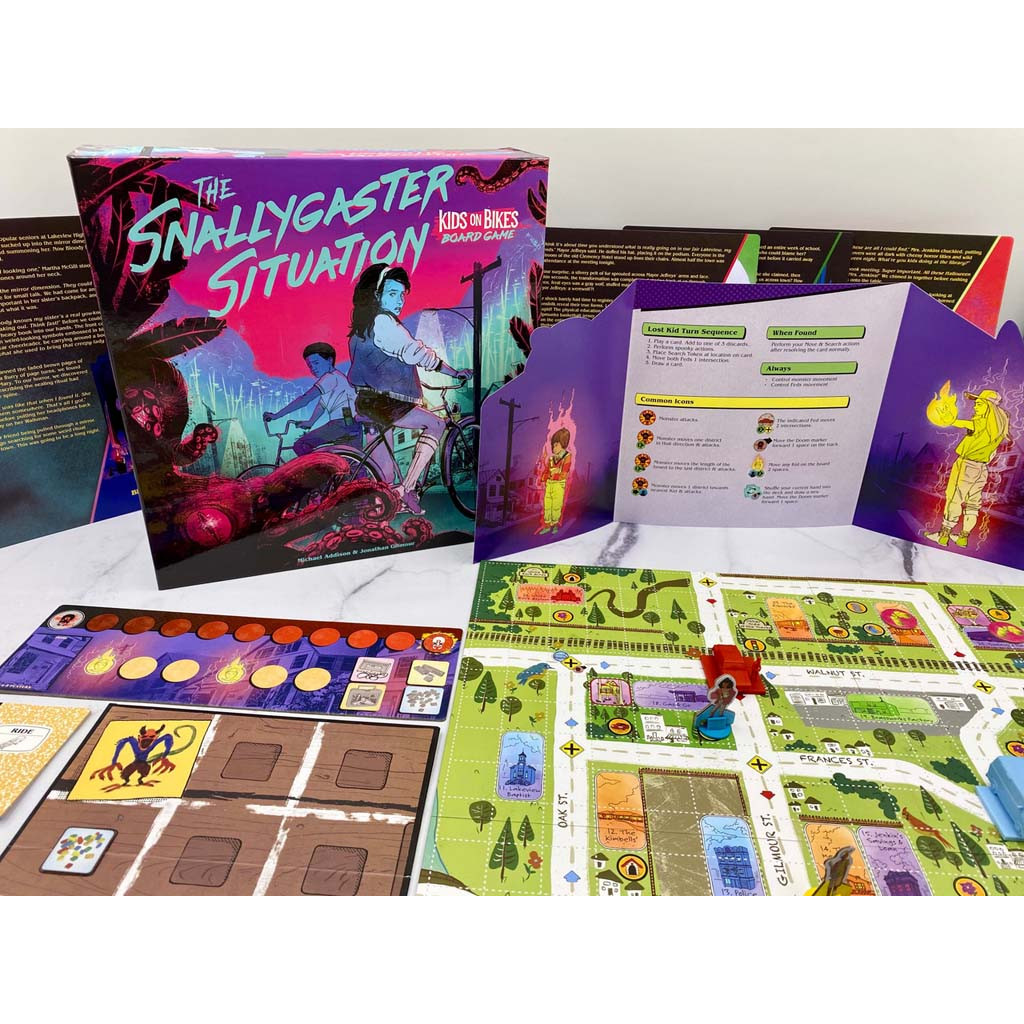 Dans The Snallygaster Situation, vous et vos meilleurs amis devez affronter l'un des quatre monstres diaboliques déterminés à détruire Lakeview, voire le monde entier ! Enfourchez vos vélos et partez à la recherche d'indices sur la faiblesse du monstre, retrouvez l'enfant disparu qu'il a enlevé et mettez fin à la menace qui pèse sur votre ville natale ! Ce pack contient également The Snallygaster Situation : A Kids on Bikes Board Game Far Out Rides Bonus Pack