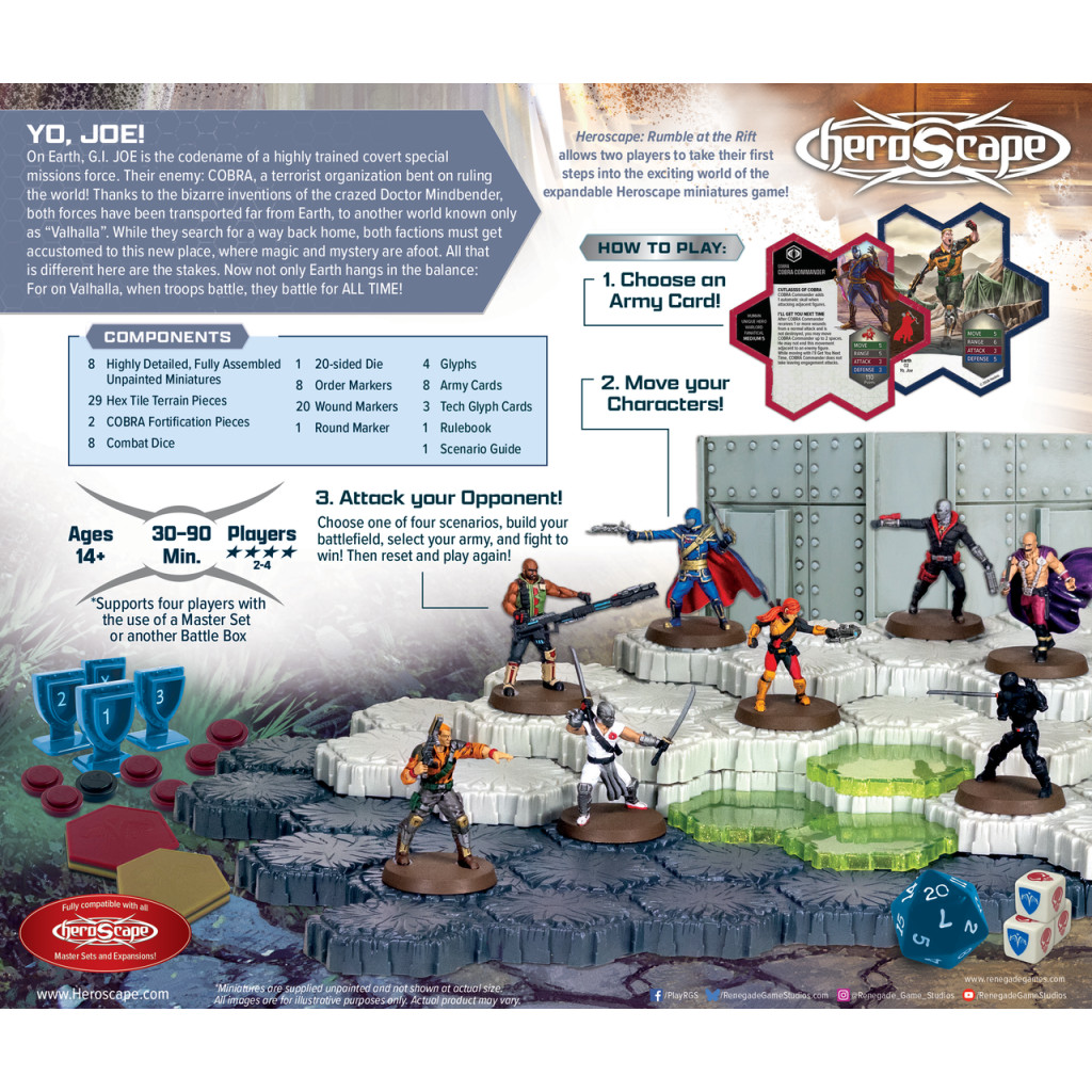 Cette Boîte de Combat contient tout ce dont deux joueurs ont besoin pour se lancer dans Heroscape : 8 figurines très détaillées, un terrain modulaire en hexagones, des fortifications COBRA, des dés, des marqueurs, ainsi que toutes les cartes, règles et scénarios nécessaires pour une rejouabilité infinie. Duke, Scarlett, Roadblock, Snake Eyes, COBRA Commander, Destro, Storm Shadow et Docteur Mindbender sont prêts à mener une guerre totale dans ce nouveau monde ! Cette Boîte de Combat est entièrement compatible avec toutes les autres sorties Heroscape. Étendez vos forces avec n'importe quelle extension Heroscape pour des batailles encore plus grandioses !