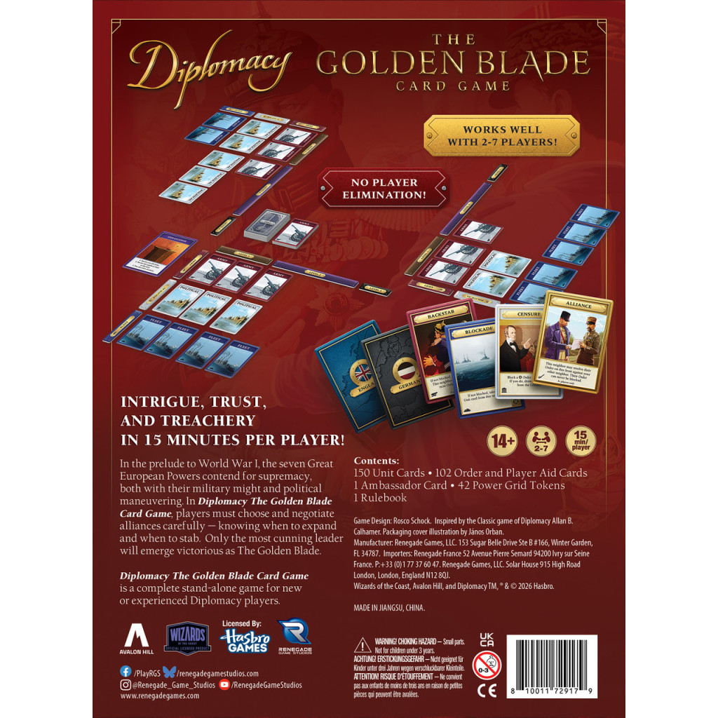 Diplomacy: The Golden Blade Card Game est un jeu complet et indépendant qui plaira aux joueurs de Diplomacy novices comme expérimentés.