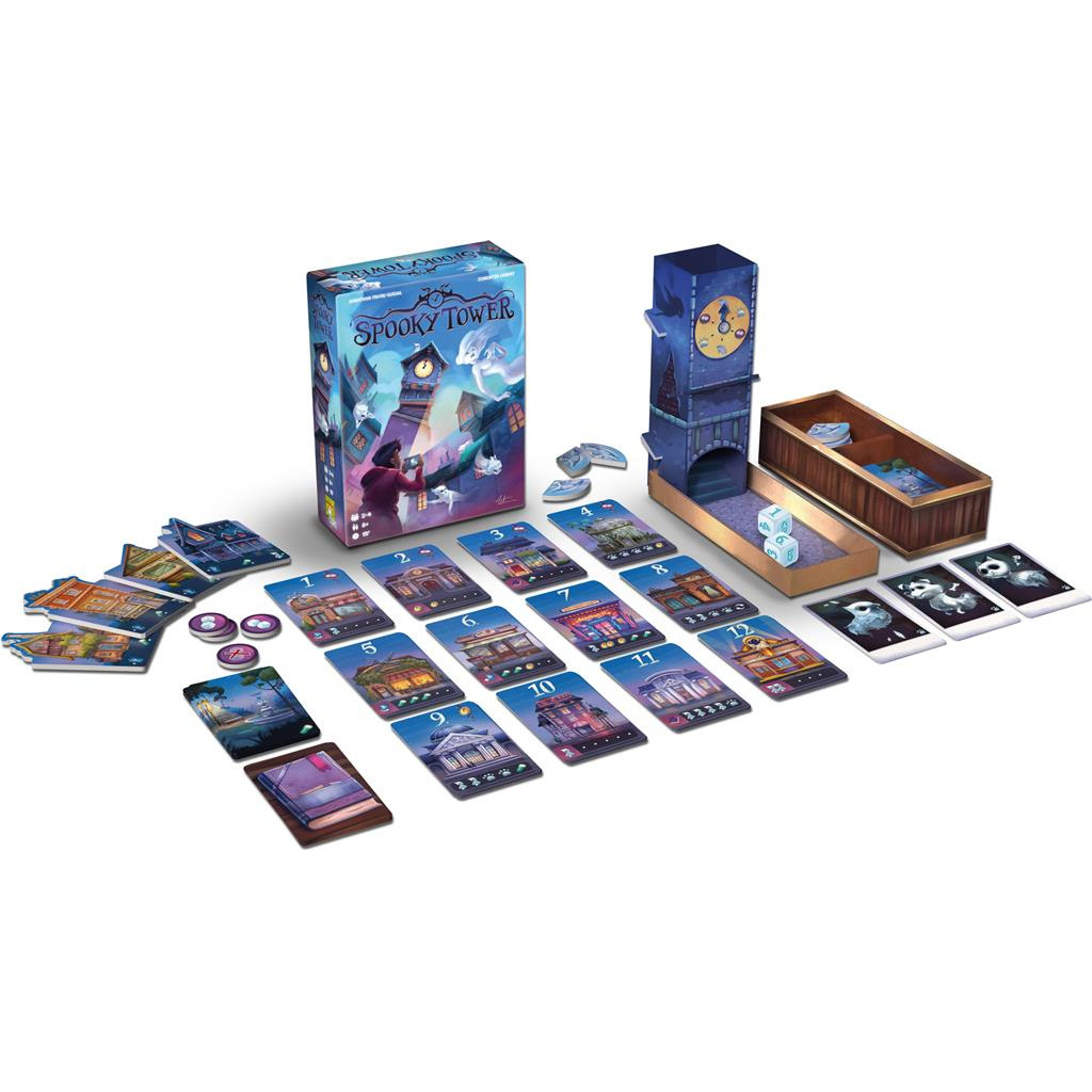 Au cœur du jeu : une tour de l’horloge faisant office de tour à dés, intégrée directement dans la boîte. Chaque lancer détermine les bâtiments accessibles, mais laisse toujours un choix crucial aux joueurs :