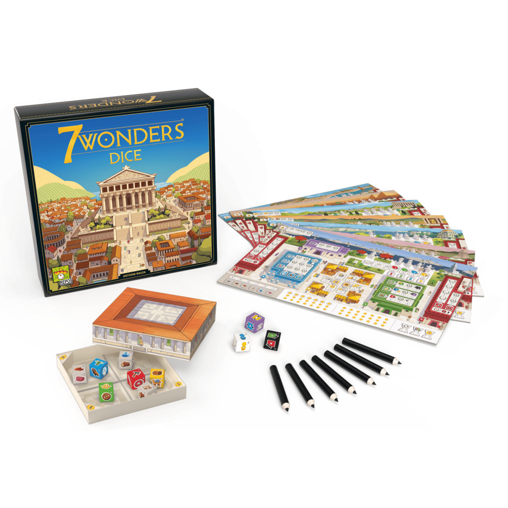 Dans 7 Wonders Dice, chaque joueur fait prospérer sa cité antique en lançant des dés et en construisant bâtiments et Merveille