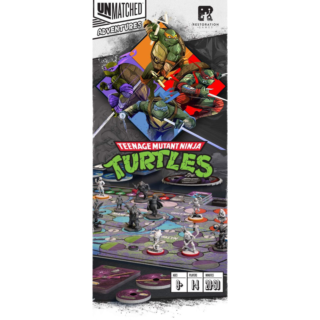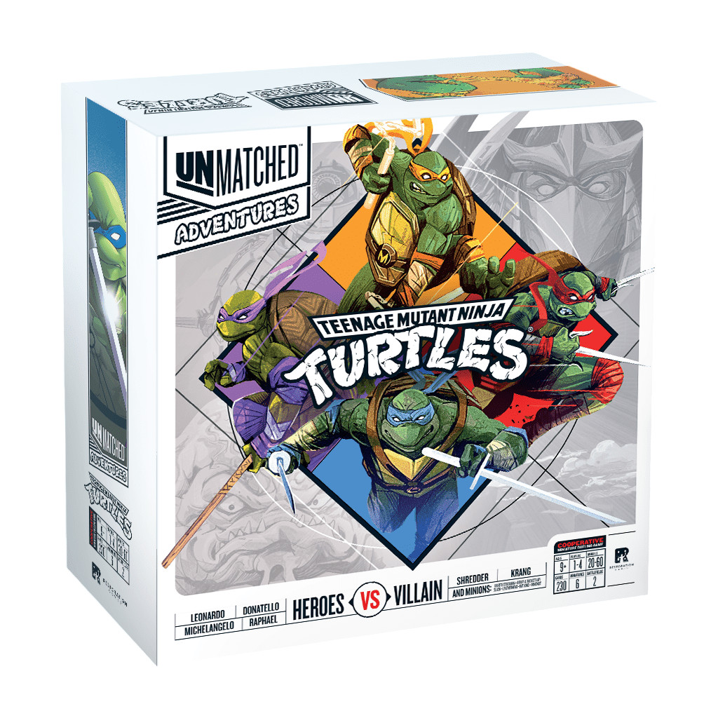 Unmatched Adventures reprend le système de combat primé du Unmatched classique et y ajoute une dimension coopérative amusante où 1 à 4 joueurs collaborent pour vaincre l'un des deux vilains du set. Les Tortues affrontent Shredder, qui envoie des vagues de soldats du Foot Clan à travers la Grosse Pomme. Ou osez pénétrer dans le Technodrome et mesurez-vous à Krang, qui utilise les pièges et gadgets imprévisibles de la Dimension X. Et gardez un œil sur la multitude de sbires qu'ils peuvent appeler en renfort : Bebop et Rocksteady, Baxter Stockman, Leatherhead, et bien d'autres !