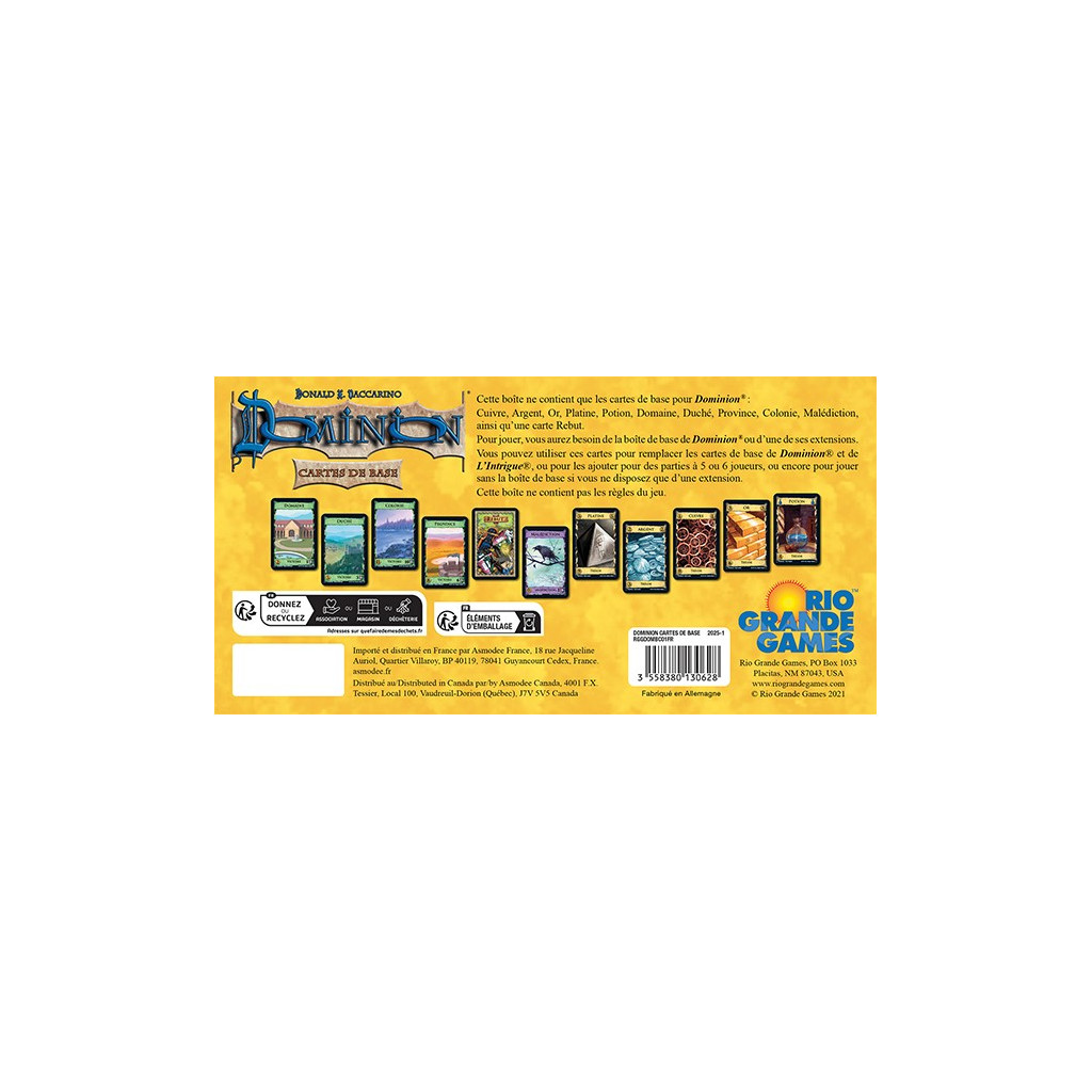 Cette boîte ne contient que les cartes de base de Dominion : Cuivre, Argent, Or, Platine, Potion, Domaine, Duché, Province, Colonie, Malédiction, ainsi qu'une carte Rebut.
