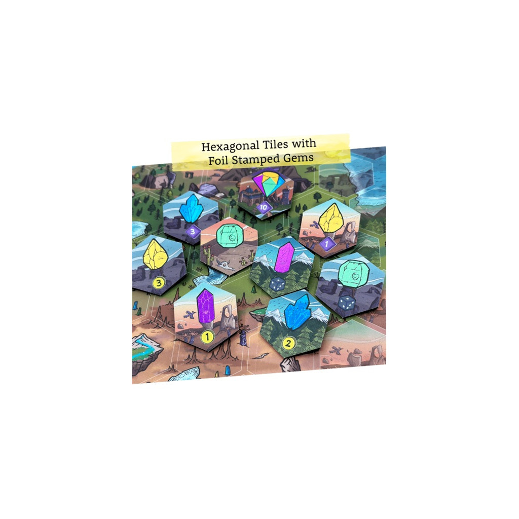 Explorez Iridescia en retournant les tuiles de terrain, révélant les gemmes cachées sous celles-ci, puis lancez les dés pour les extraire. Chaque couleur de gemme est liée à une valeur de dé qui peut être manipulée pour vous aider dans votre quête. Obtenez un score suffisamment élevé et vous pourrez réclamer plus de gemmes, les ajoutant à votre cargaison et vous fournissant une ressource précieuse pour restaurer des reliques et marquer des points de royauté !