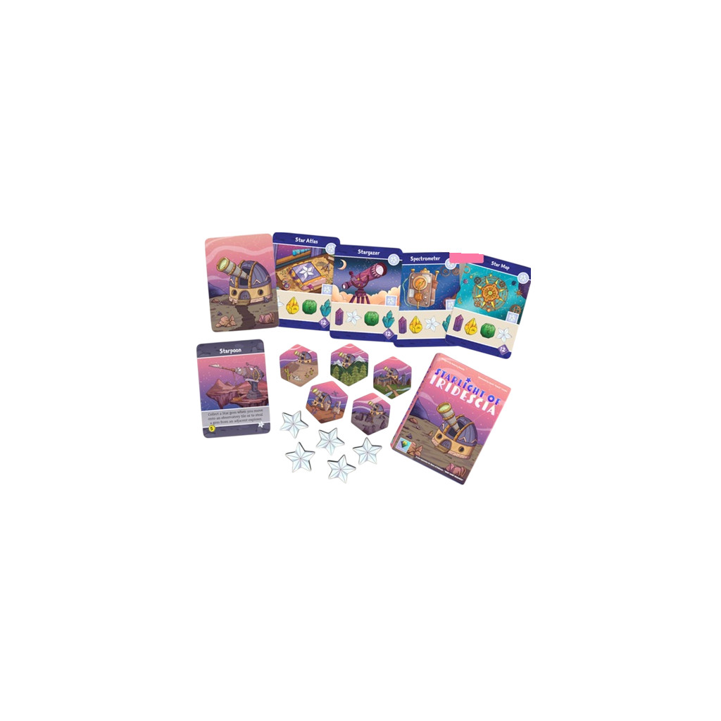 Gems of Iridescia - Starlight of Iridescia est une mini-extension qui introduit une nouvelle gemme, quatre cartes reliques, une carte objet et cinq nouvelles tuiles hexagonales. L'extension tire parti du verso nocturne du plateau.