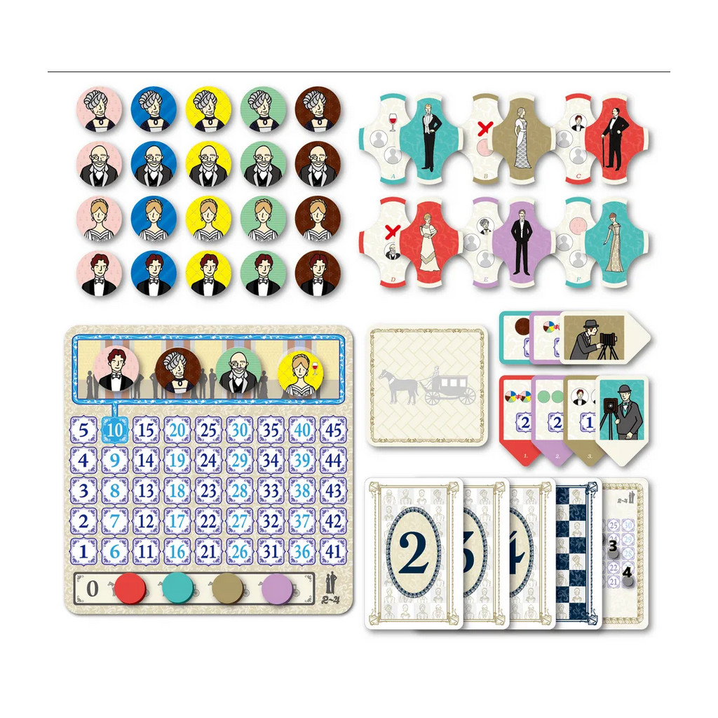 Pour commencer, chaque joueur dispose d’un ensemble de six tables VIP, chacune pouvant accueillir quatre invités ; les invités se déclinent en cinq couleurs et quatre types, avec cinq jetons de chaque — l’un d’entre eux levant son verre pour porter un toast.