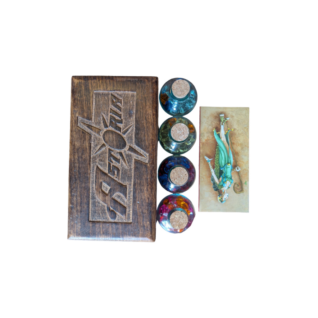 L´intérieur du coffret révèle quatre flacons de verre fermés par leurs bouchons de liège, 60 grandes gemmes brillantes, un set de 66 cartes de jeu (60 illustrations différentes sur ces cartes), un set de pions, un plateau dépliant papier recto/verso, et deux règles complètes.