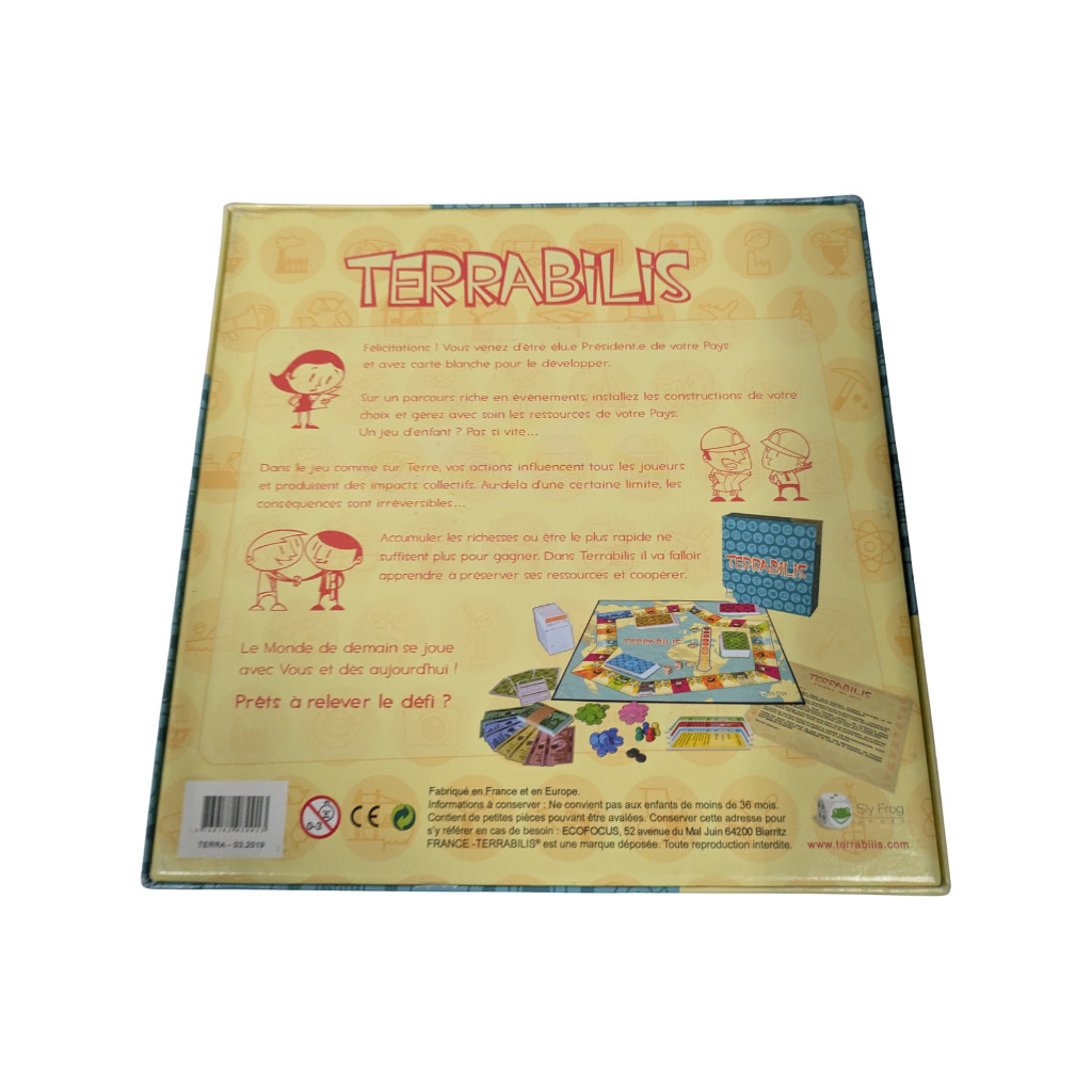 Terrabilis est un jeu de société semi-coopératif et stratégique basé sur les enjeux du développement durable, où chaque joueur dirige un pays et doit gérer argent, énergie, ressources sociales et naturelles pour faire prospérer sa nation sans épuiser la planète. Les décisions prises affectent l’environnement, la qualité de vie, l’énergie et l’économie, et poussent les joueurs à trouver un équilibre entre croissance, solidarité et impacts écologiques
