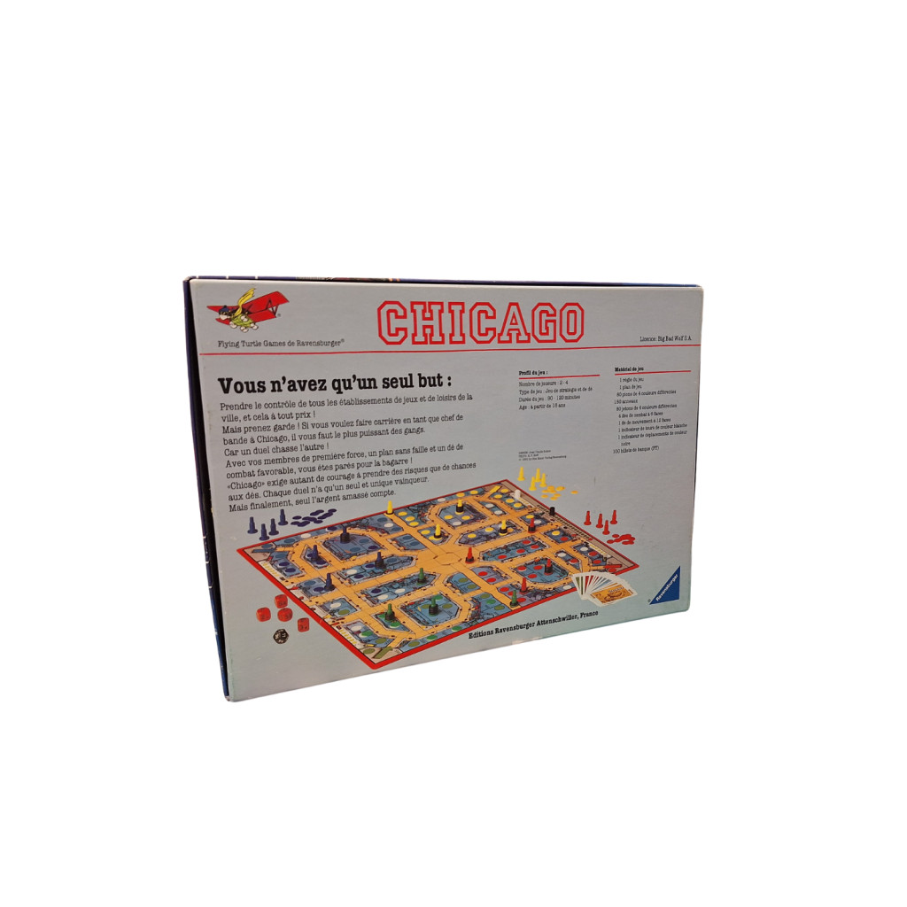 Chicago - seconde main est un jeu de société de stratégie et de contrôle de territoire, édité par Ravensburger et conçu par Jean Claude Soheir.