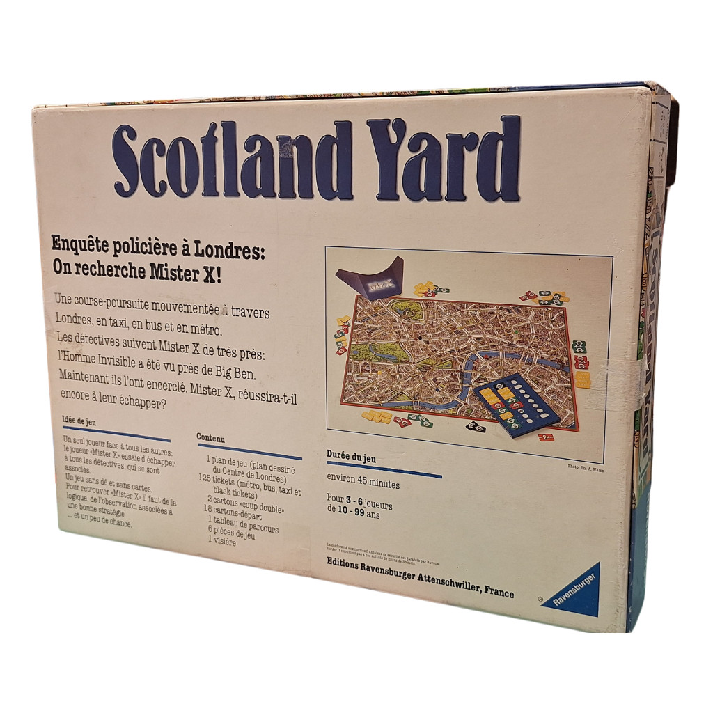 Scotland Yard est un jeu de déduction et de poursuite dans lequel un joueur incarne le mystérieux criminel Mister X, tandis que les autres jouent des détectives lancés à sa poursuite dans les rues de Londres. Le but des enquêteurs est de coopérer pour localiser et capturer Mister X, qui se déplace secrètement sur la carte en utilisant différents moyens de transport.