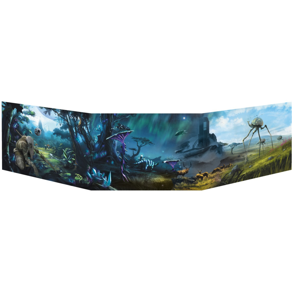 Un écran de jeu composé de 3 volets A4 au format paysage, dans du carton rigide, avec une représentation de Chrysalis d’un côté, et des aides de jeux de l’autre.