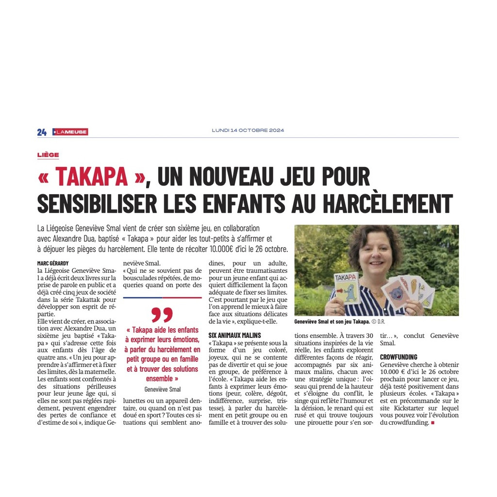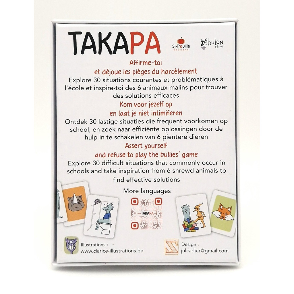 Concocté à la fois par Alexandre Dua (Editions Zébulon) et Geneviève Smal (Si-Trouille Éditions), Takapa veille à donner aux enfants toutes les ressources pour faire face aux difficultés relationnelles. Il ouvre la porte à l'expression orale, à la formulation des émotions et aux différentes manières de prendre confiance en soi en exprimant ses sentiments face à 30 situations problématiques.