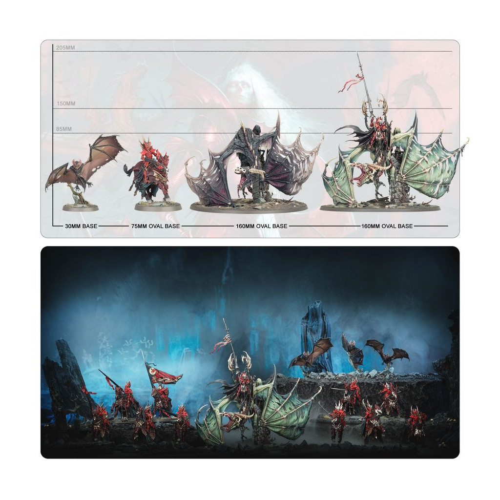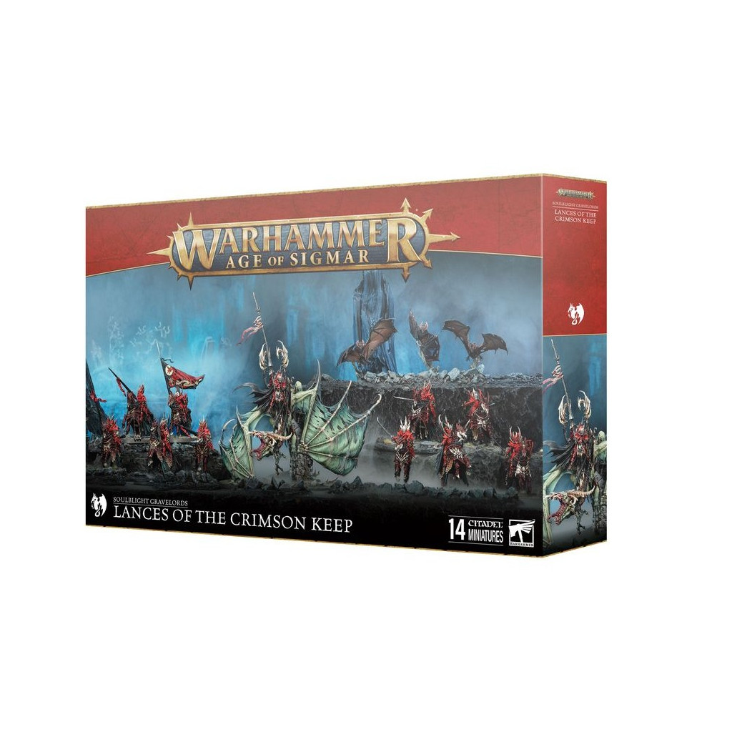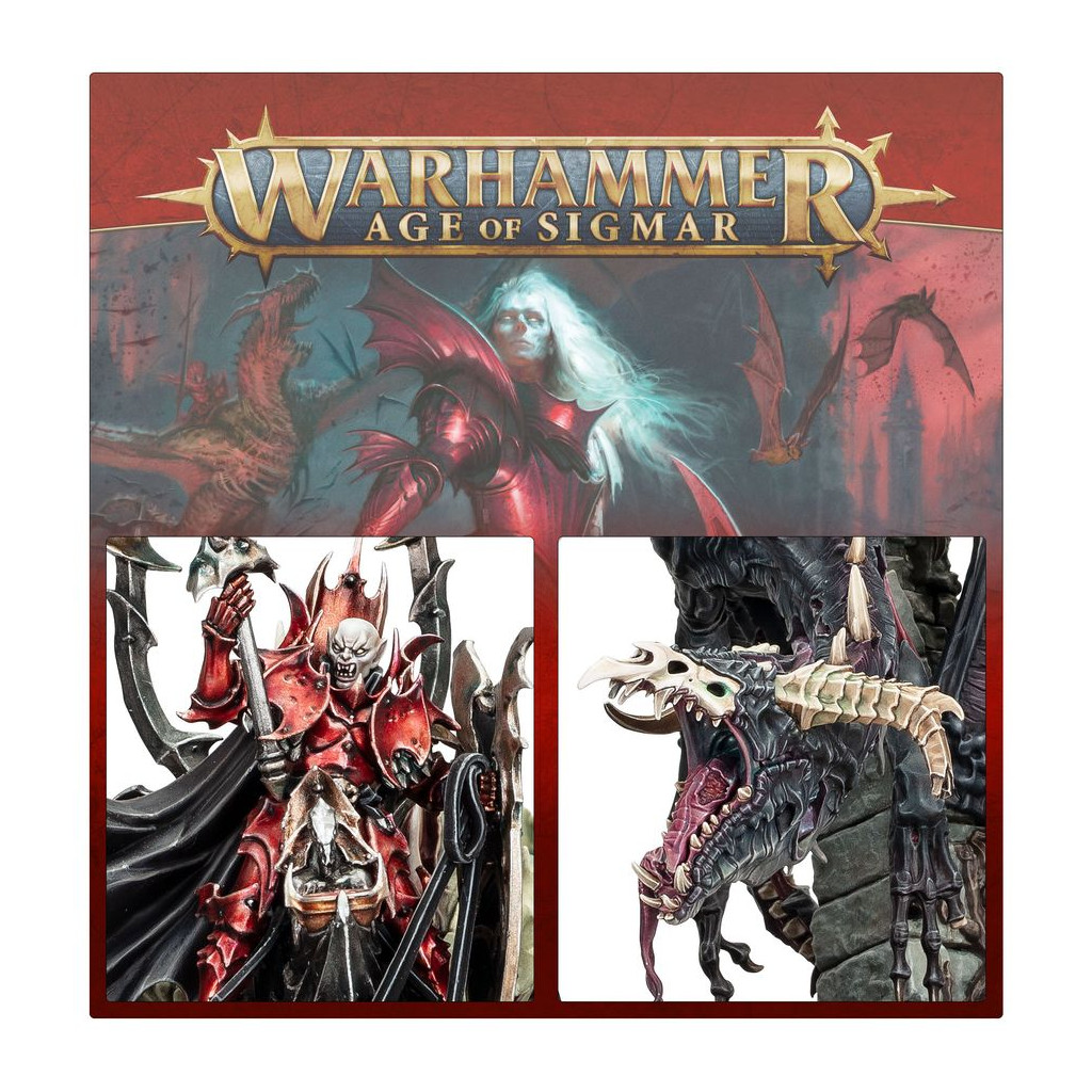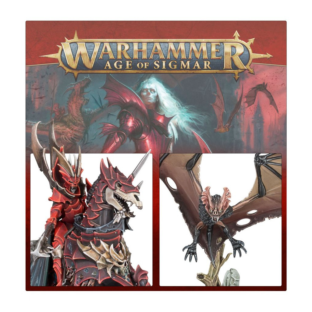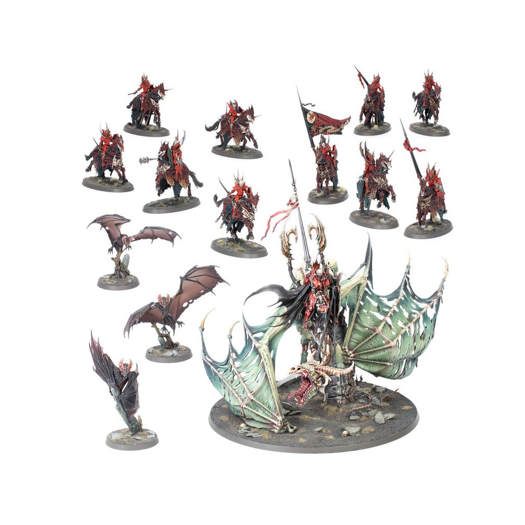 Cette boîte pleine à craquer est parfaite pour entamer une nouvelle collection de Seigneurs Ruinemânes ou pour étoffer une armée existante, que vous pourrez ensuite déchaîner dans les parties de Warhammer Age of Sigmar tout en faisant des économies par rapport à un achat des kits au détail. Cette force très mobile est menée par le Prince Vhordraï, Seigneur du Fort Pourpre, monté sur son Draconithe mort-vivant appelé Shordemaire. Il est prêt à s'occuper des unités les plus robustes que votre adversaire pourra vous opposer. Dix Chevaliers de Sang, résistants et dévastateurs, soutiennent sa charge, tandis que trois Chauves-souris Géantes complètent cette armée en allant capturer les objectifs et harceler les unités ennemies.