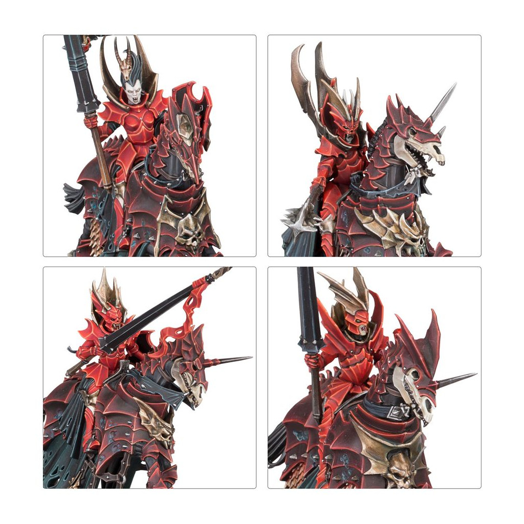 Les Chevaliers de Sang peuvent être armés d'une lance ou d'une épée, et chacun dispose d'un choix de deux têtes, nue ou casquée. Vous trouverez également les éléments nécessaires pour assembler deux champions et porte-étendard optionnels.