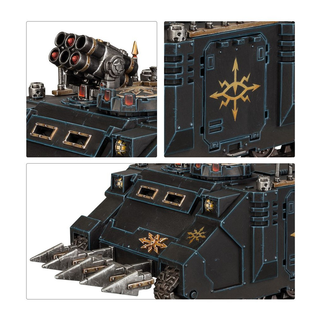 Le Rhino du Chaos dispose d'options esthétiques, dont des icônes du Chaos, des râteliers de trophées, des chaînes, des crochets, une lame de bulldozer et des plaques de blindage corrompues. Il peut être armé d'un combi-bolter ou d'une arme combinée sur pivot, et il propose les éléments nécessaires pour assembler un artilleur space marine du Chaos ou une écoutille fermée. Il peut également être équipé d'un lanceur Havoc pour améliorer sa puissance de feu à longue portée.