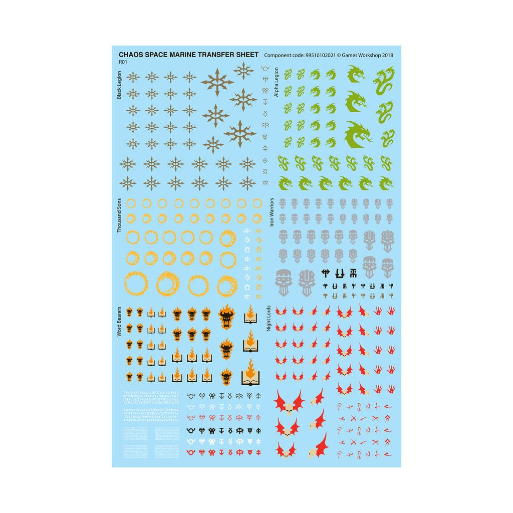 Ce kit est fourni avec 2x Planches de Décalcos des Space Marines du Chaos, proposant chacune 364 décalcos de grande qualité. Cela inclut des icônes de la Black Legion, de l'Alpha Legion, des Thousand Sons, des Iron Warriors, des Word Bearers et des Night Lords, ainsi que d'autres symboles maudits pour décorer vos figurines.
