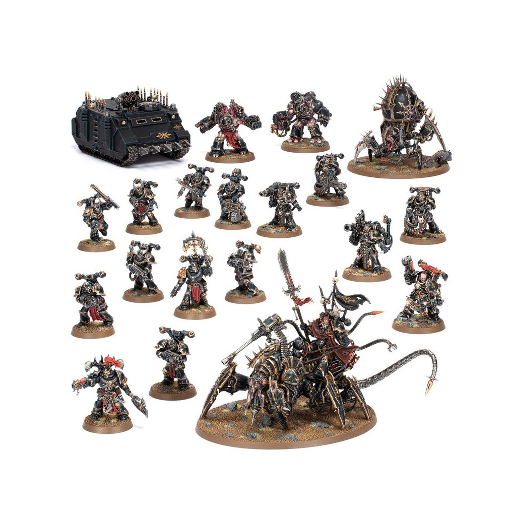 Cette boîte pleine à craquer est parfaite pour entamer une nouvelle collection de Space Marines du Chaos ou pour étoffer une armée existante que vous pourrez ensuite déchaîner dans les parties de Warhammer 40,000, en faisant des économies par rapport à un achat des kits au détail. Menée par un Seigneur de la Discorde, un vrai pivot central pour vos mêlées, et soutenue par une Métaragne, cette force est dévastatrice en combat rapproché. Une unité de Légionnaires offre une flexibilité tactique en étant capable de s'occuper des ennemis au corps à corps comme de déchaîner sa puissance de feu à distance. L'armée est soutenue à longue portée par une unité de Havocs et deux Obliterators. Pour déposer votre infanterie là où vous avez besoin d'elle, un Rhino du Chaos vient compléter cette force, ainsi constituée d'une combinaison gagnante d'unités.