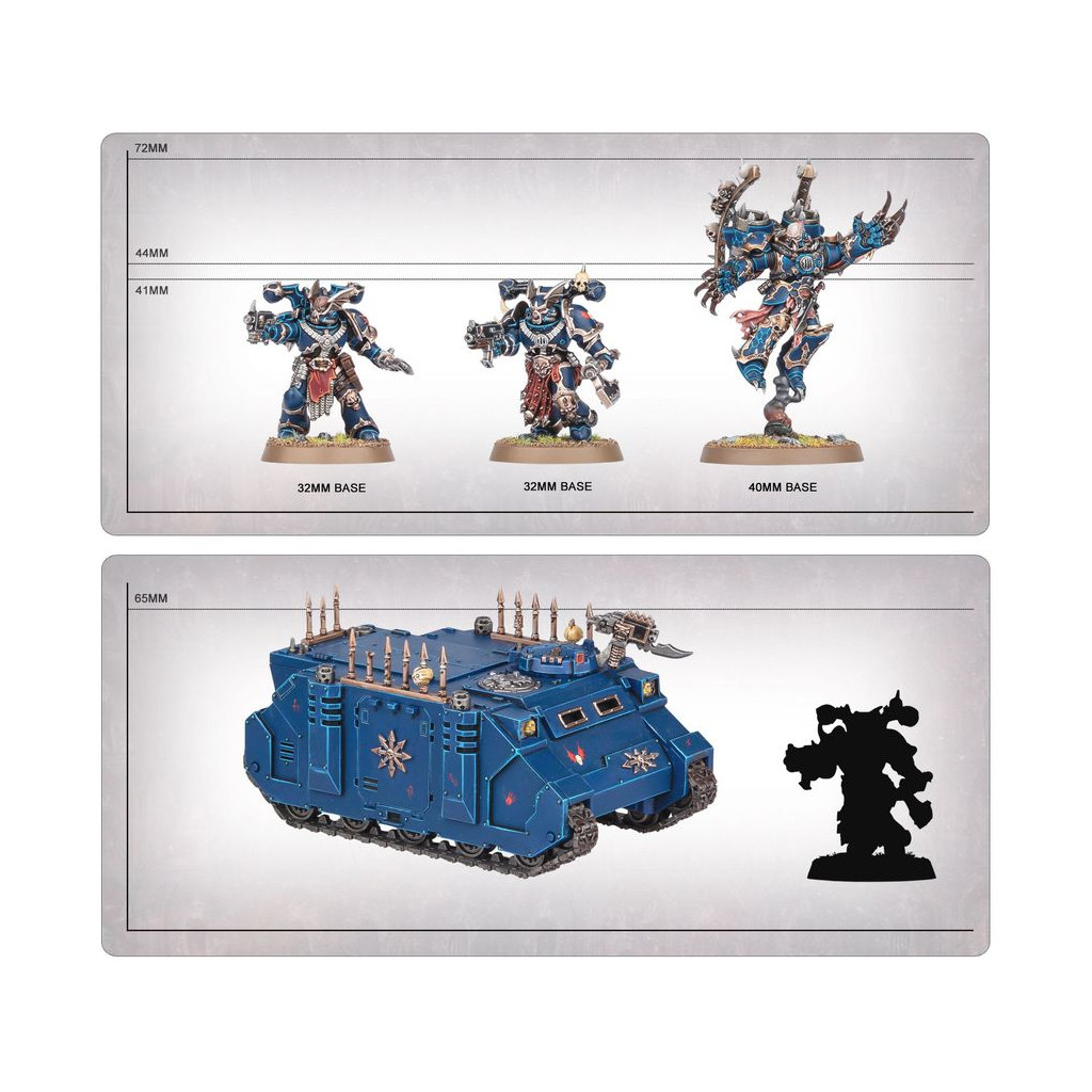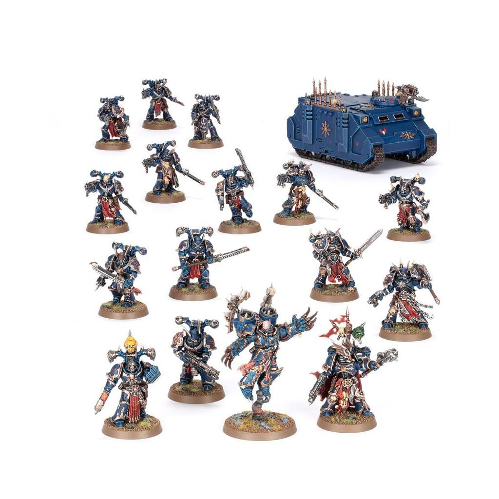 Cette boîte pleine à craquer est idéale pour entamer une nouvelle collection de Space Marines du Chaos sur le thème des Night Lords ou étoffer une armée existante, à déchaîner dans les parties de Warhammer 40,000 tout en faisant des économies par rapport à un achat des kits au détail. Cette force est menée depuis l'avant par un Seigneur du Chaos avec Réacteur Dorsal, un expert du corps à corps avide d'en découdre. L'ossature de la force est composée de Légionnaires, des troupes de ligne polyvalentes tout aussi capables de s'emparer des objectifs clés que de libérer des salves dévastatrices. Une unité d'Élus vient apporter le renfort de ses millénaires d'expérience ainsi que de ses terribles armes de corps à corps. Le Rhino du Chaos vous permettra de transporter l'une de vos unités là où elle le désire de façon relativement sécurisée et apporte un surplus de mobilité à cette force. Ces 17 figurines en plastique représentent une force complète de Space Marines du Chaos utilisable dans des parties réduites et tactiques au format Patrouille de Warhammer 40,000. Les règles permettant d'utiliser cette Patrouille sont disponibles en téléchargement gratuit sur le site de Warhammer Community. Cette boîte n'est disponible que dans la limite des stocks.