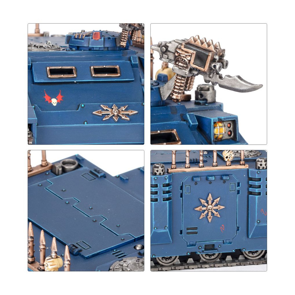 Le Rhino du Chaos est fourni avec diverses options décoratives, comme des icônes du Chaos, des râteliers de trophées, des chaînes, des crochets, des pointes de proue, des plaques de blindage corrompues et un lance-missiles Havoc. Son combi-bolter peut être amélioré en arme combinée, et il y a des options pour assembler un artilleur, un pilote ou une écoutille fermée.