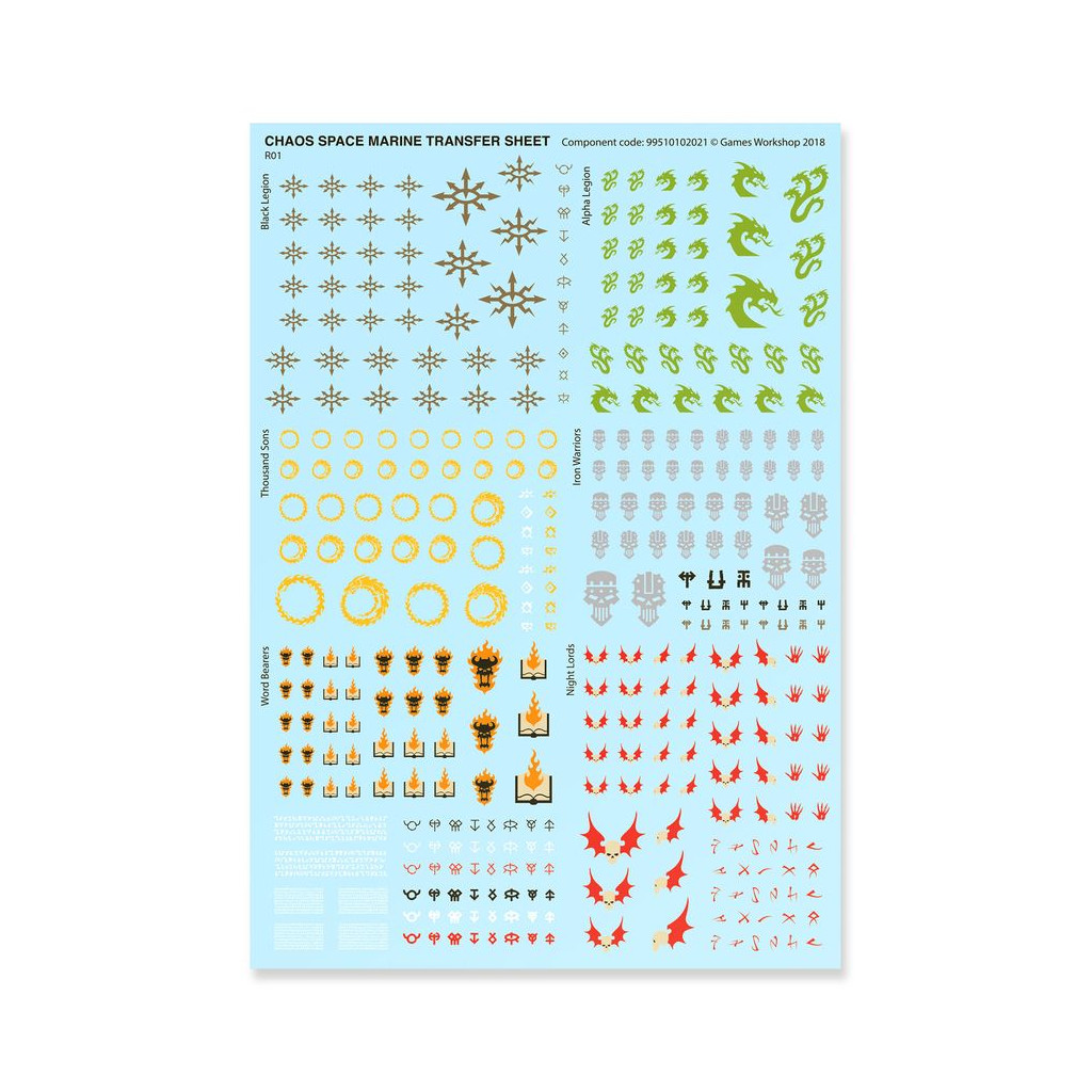 La boîte contient également 1x Planche de Décalcos des Space Marines du Chaos, proposant 364 décalcos de grande qualité pour décorer vos figurines, dont des symboles pour la Black Legion, l'Alpha Legion, les Thousand Sons, les Iron Warriors, les Word Bearers et les Night Lords, ainsi que de nombreux autres symboles maudits.