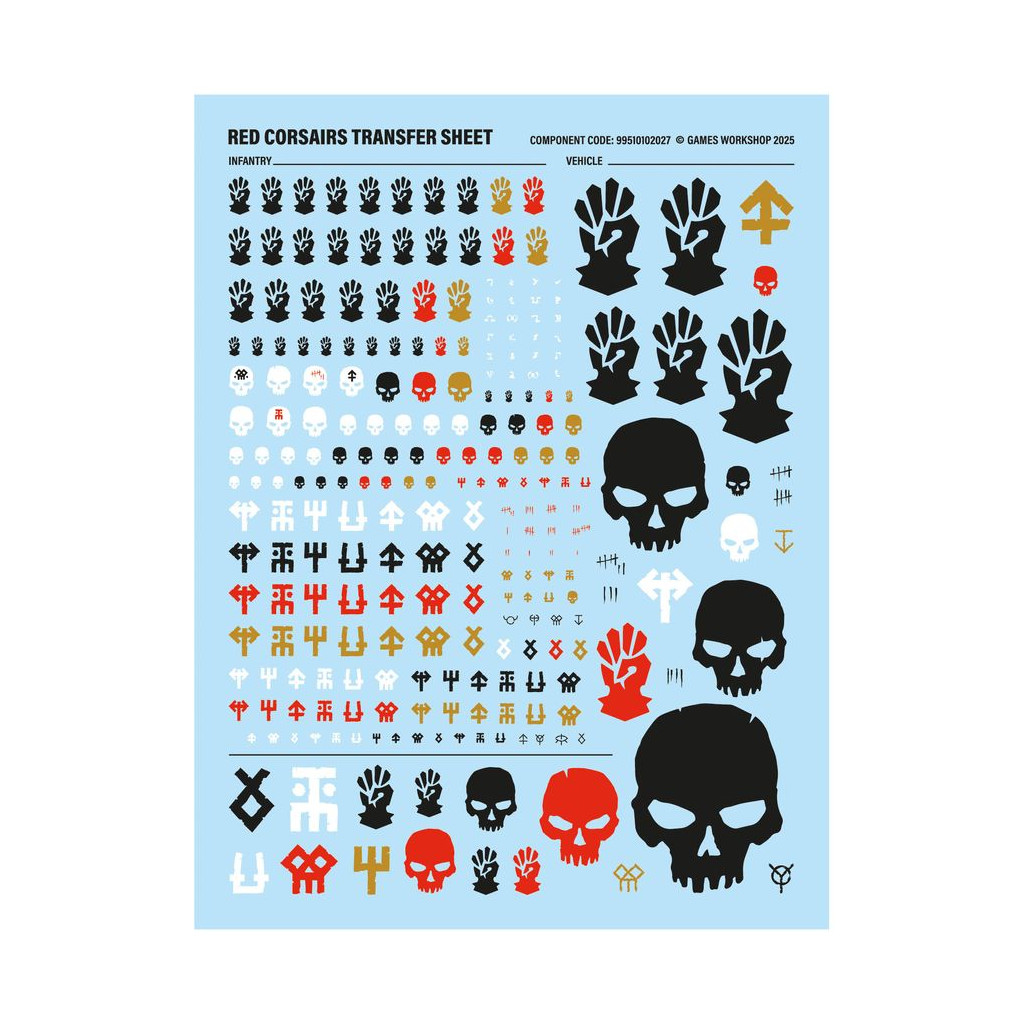 Ce kit contient aussi 1 Planche de Décalcos des Red Corsairs, comportant 248 décalcos de grande qualité. Cela inclut un choix de décalcos pour l'infanterie et les véhicules dépeignant l'iconographie des Red Corsairs, des crânes, des décomptes de victimes et autres symboles scélérats.