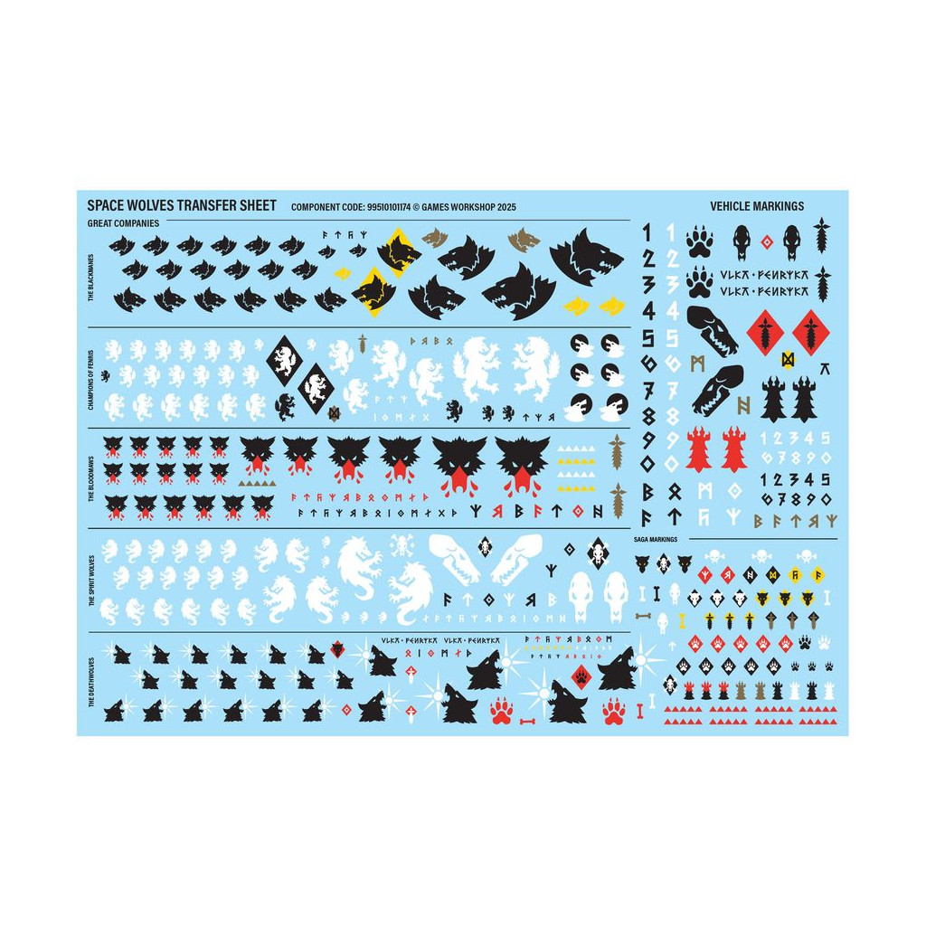 Ce kit est fourni avec 1x Planche de Décalcos Space Wolves, comprenant 419 décalcos de grande qualité. Celles-ci incluent des symboles pour les Grandes Compagnies des Crinières Noires, des Champions de Fenris, des Gueules Sanglantes, des Esprits-Loups et des Loups de la Mort, ainsi que des marquages de véhicule et de saga.