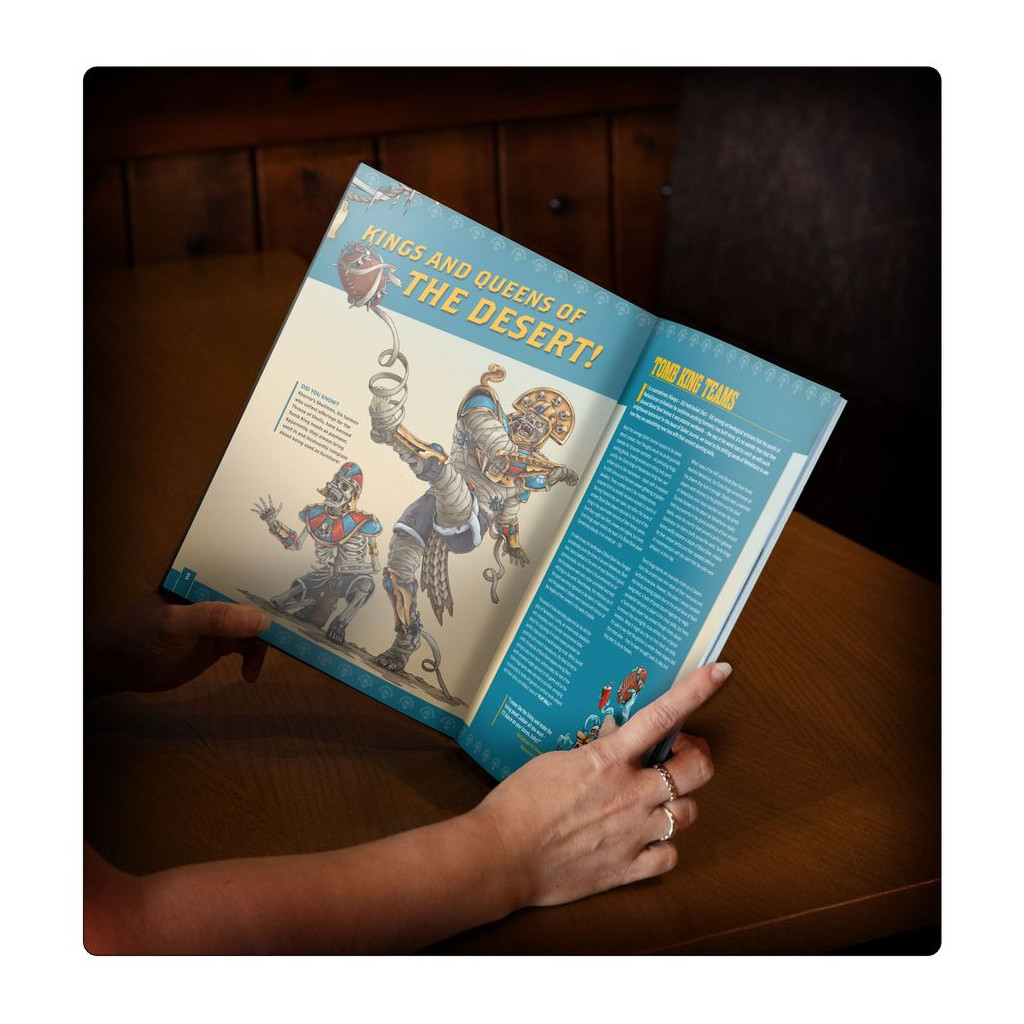 Présentation des Tomb Kings. Vous recherchez une équipe composée de joueurs puissants et redoutables ? Vous souhaitez entraîner des joueurs décédés vêtus de tenues élégantes ? Vous adorez envoyer vos adversaires chez l'apothicaire ? Une équipe composée d'anciens joueurs morts-vivants est faite pour vous !
