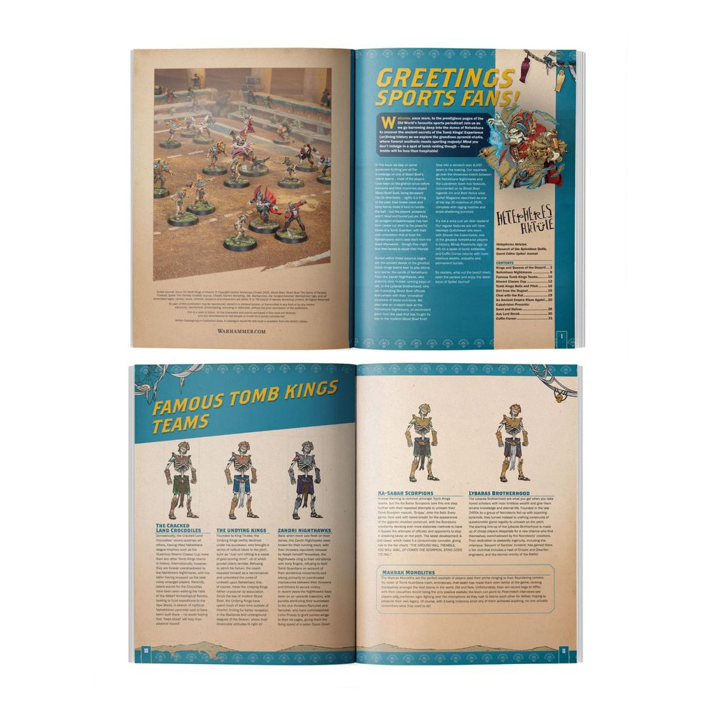 Le rédacteur invité Hetepheres Aktulye, monarque des Plumes splendides, dépoussière les parchemins pour un numéro royal du Spike! Journal, consacré aux Cauchemars de Nehekhara. Ce numéro passionnant vous aidera à tirer le meilleur parti de votre équipe et comprend des règles pour les terrains et les ballons à thème, la Khemri Classic Cup, des conseils d'entraînement et des éditoriaux divertissants.