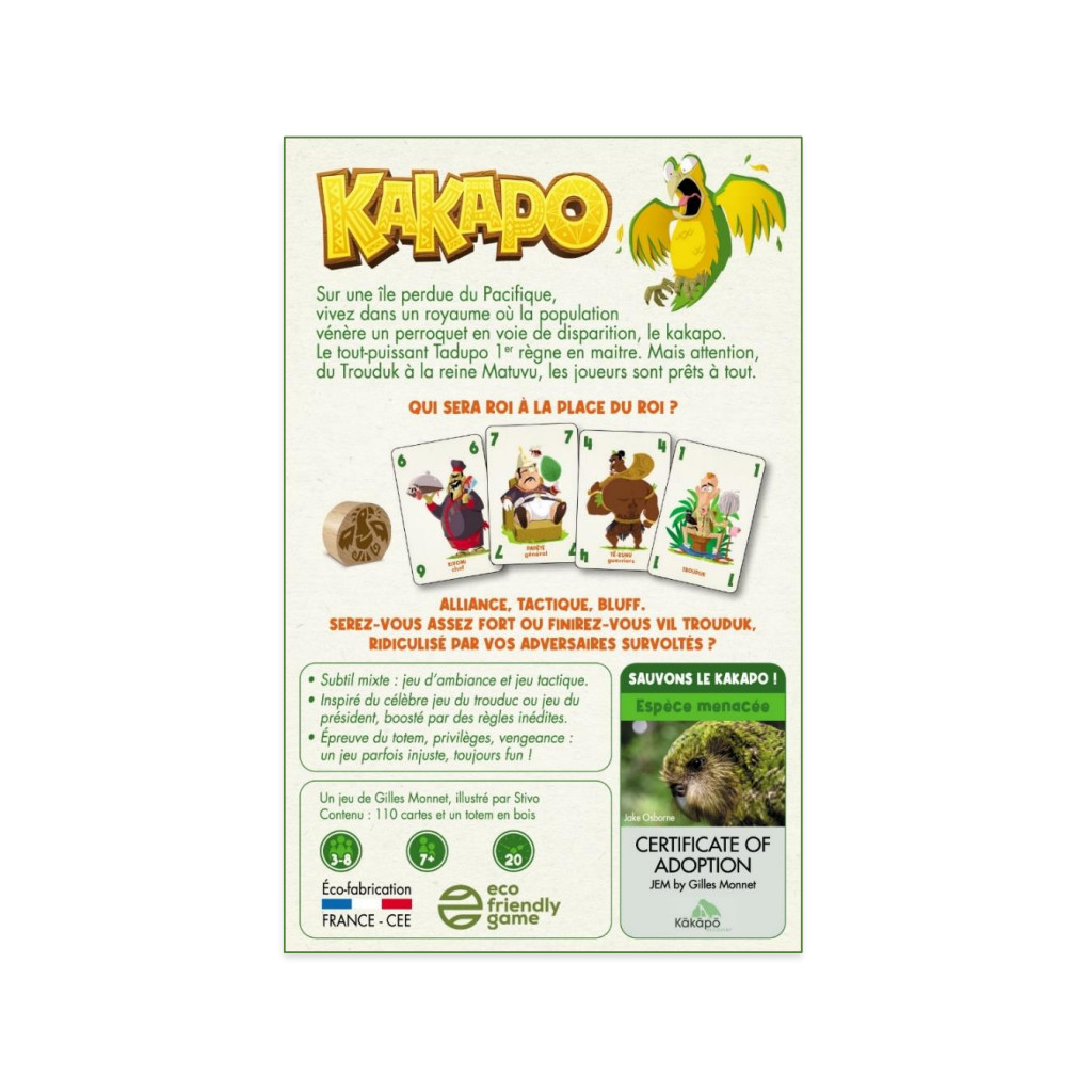 Kakapo est un jeu centré sur ce perroquet du Pacifique en voie d'extinction. Un jeu parfois injuste, toujours fun dont l'objectif est de se débarrasser le premier de toutes ses cartes pour être couronné roi.