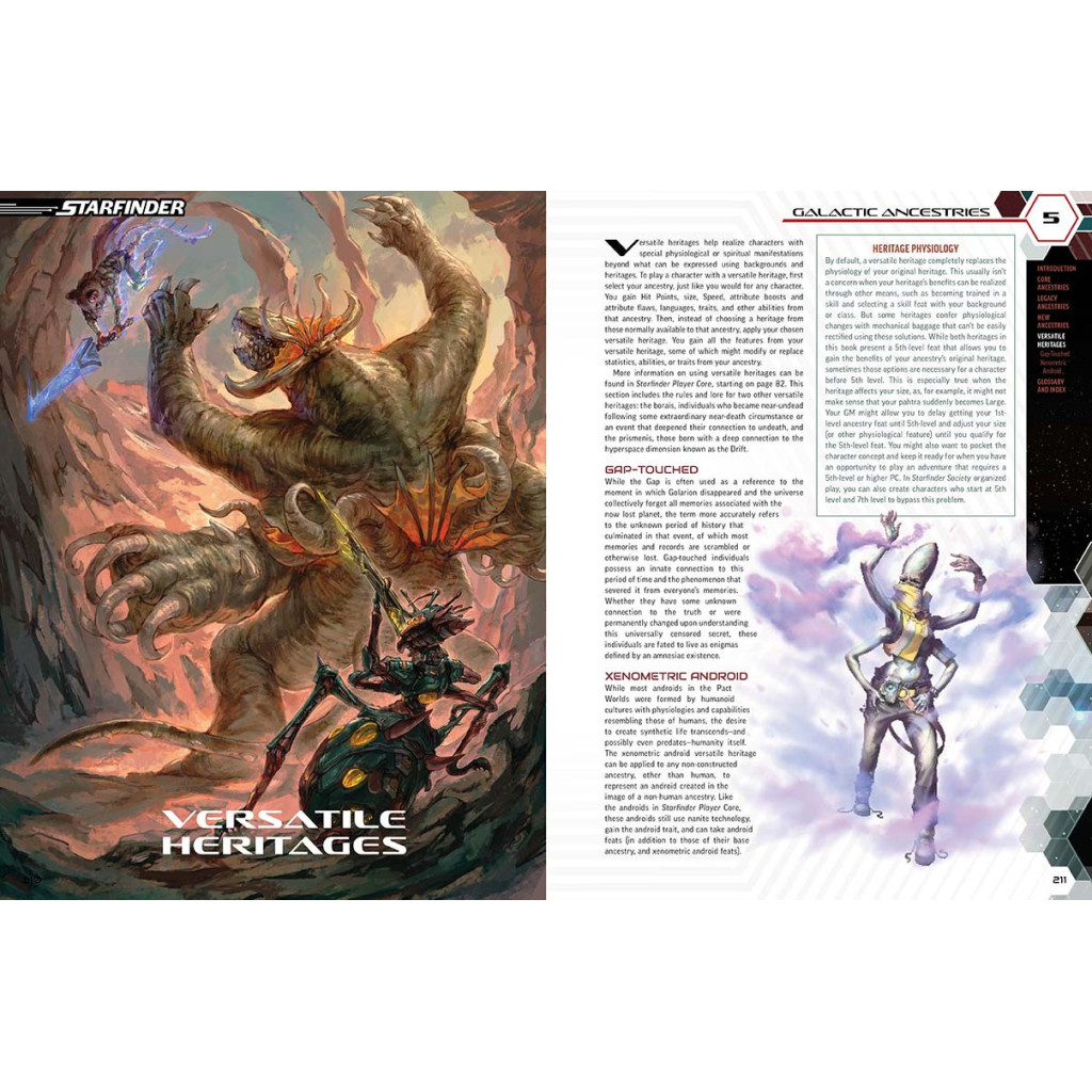 Par-dessus tout, le nouveau patrimoine polyvalent touché par la Faille connecte les joueurs à l'événement fracturant l'histoire au cœur de l'univers Starfinder tout en leur conférant des capacités spéciales, et l'androïde xénométrique permet aux lecteurs de créer des versions robotiques de n'importe quel extraterrestre Starfinder, pas seulement des humains !