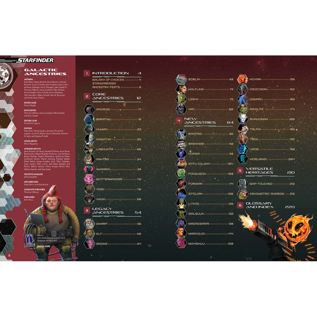 Ce livre de règles de 224 pages regorge d'ascendances extraterrestres jouables pour les parties de Starfinder Seconde Édition, comprenant 21 options entièrement nouvelles comme les chanceux worlanisis bleus, les bantrids — des boules roulantes sentientes — ou même un novian, un soleil miniature flamboyant. En plus de cette distribution intergalactique d'espèces de science-fantasy, on trouve une multitude d'options stellaires pour les ascendances familières, incluant des favoris de Starfinder comme les vesks reptiliens et les shirrens insectoïdes, ainsi que des classiques de la fantasy comme les gnomes, les elfes et les gobelins dans l'espace !