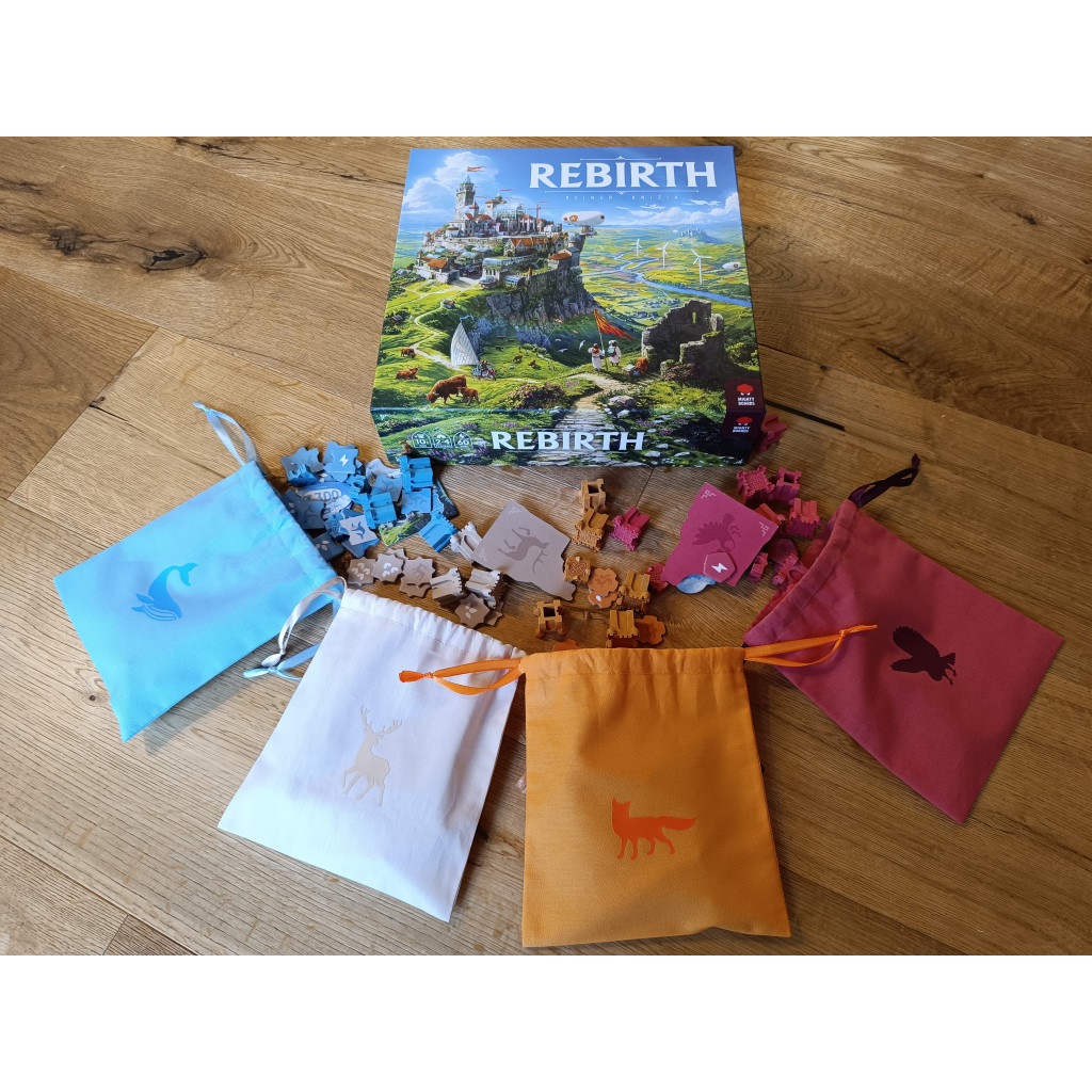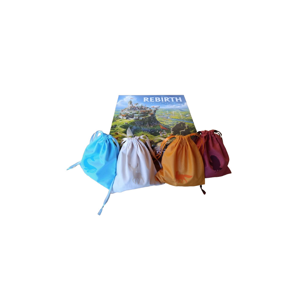 Lot de quatre sacs aux couleurs vives, chacun orné d'un logo animal assorti, compatible avec le jeu de société Rebirth. Assez grands pour ranger tous les composants de chaque joueur et piocher des tuiles pendant la partie. Fini les mélanges et les empilages secrets. Installation rapide, rangement pratique et superbe présentation visuelle, tout-en-un !