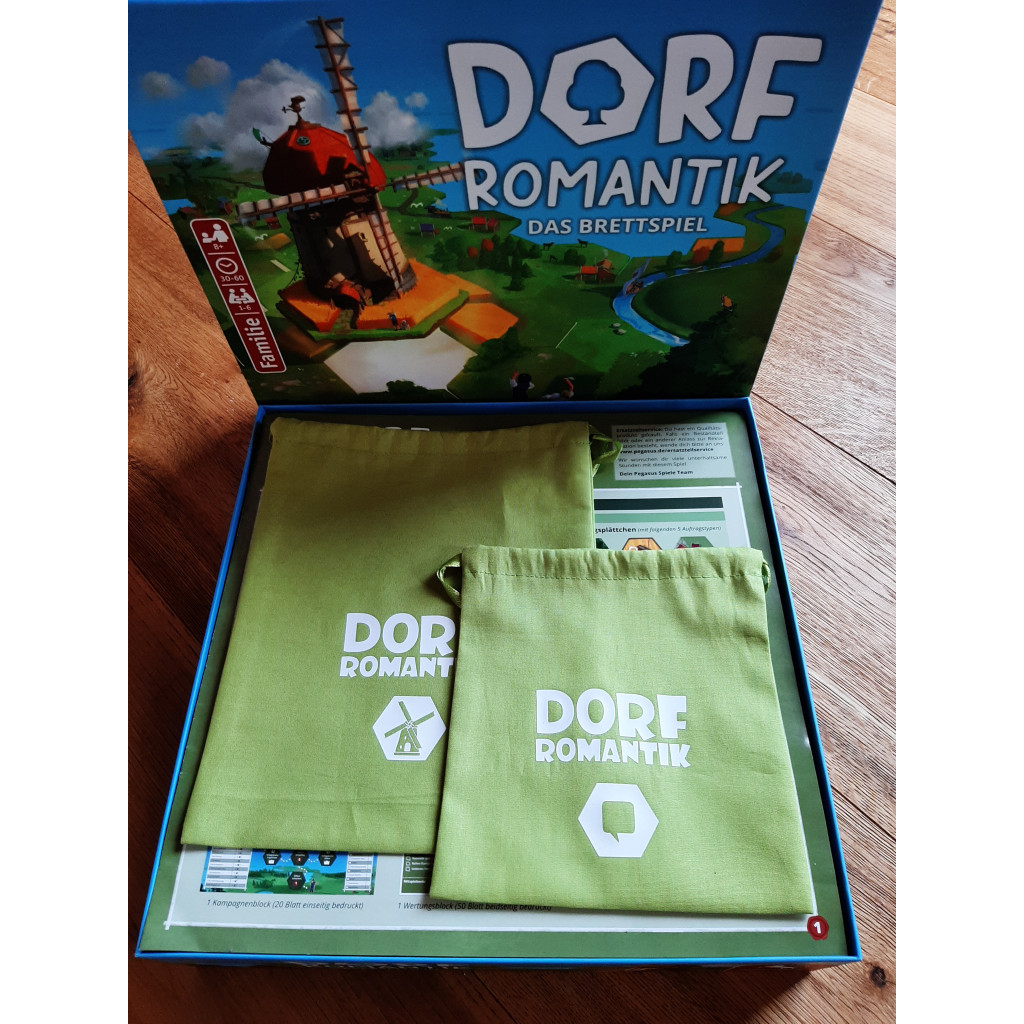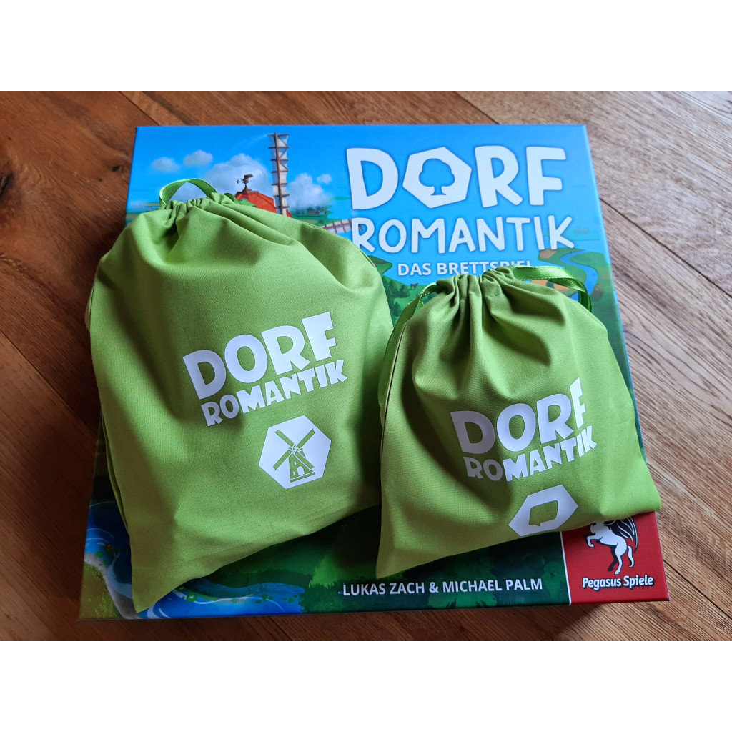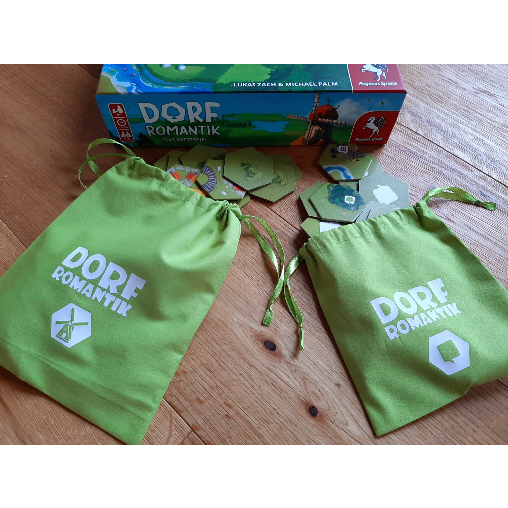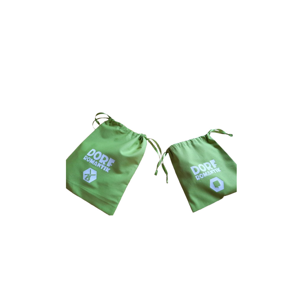 Lot de deux sacs compatibles avec le jeu de société Dorfromantik, verts, avec logos assortis. Les tuiles Paysage et Tâche peuvent désormais être facilement tirées des sacs pendant la partie. Plus besoin de mélanger ni d'empiler les tuiles. Installation rapide et esthétique soignée !